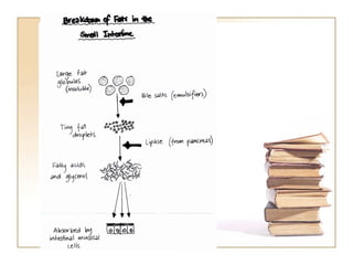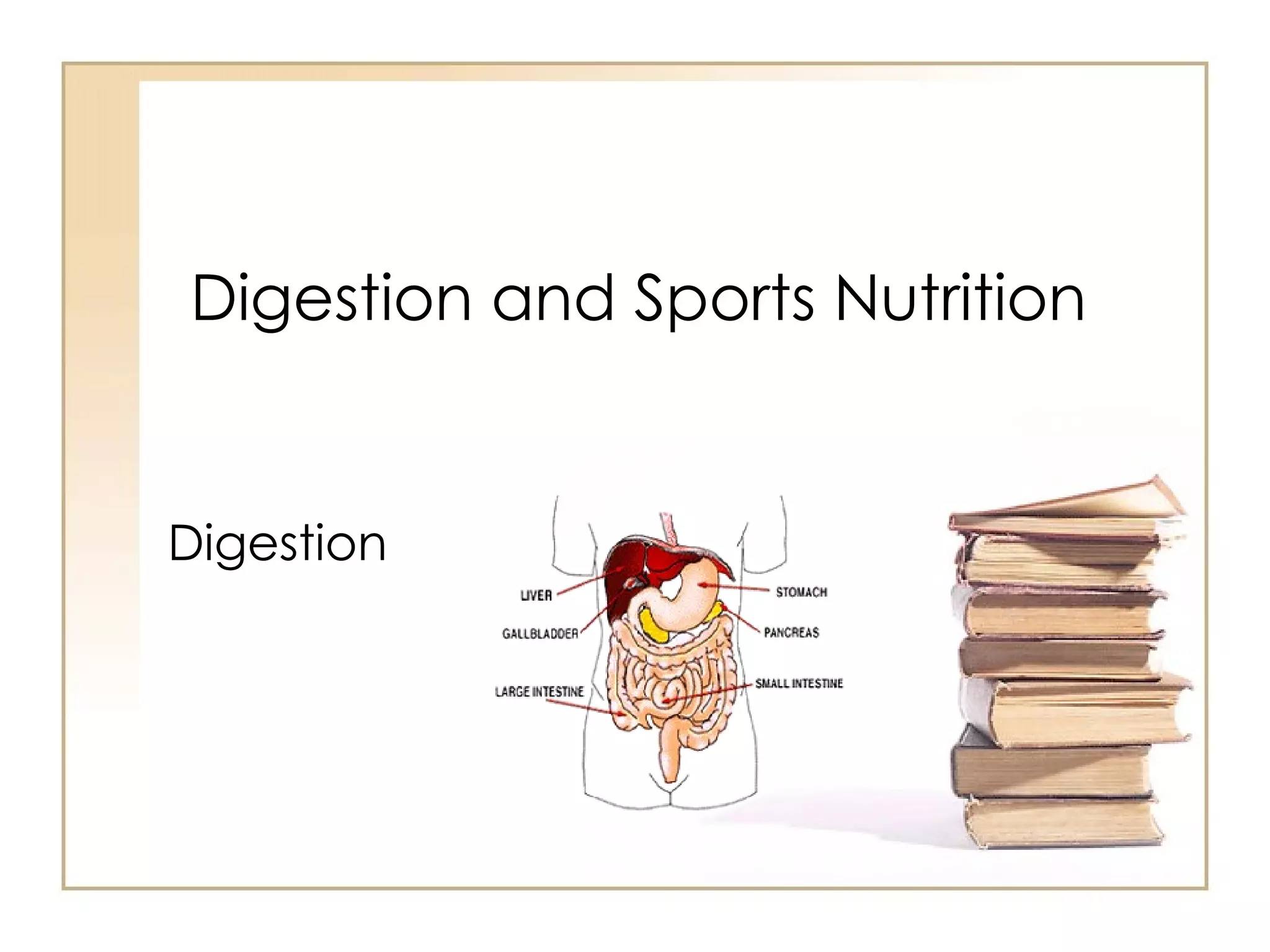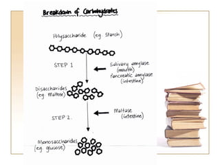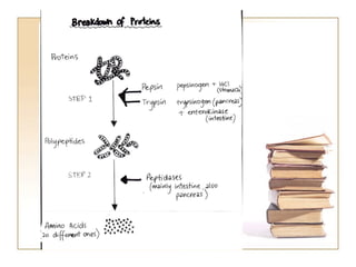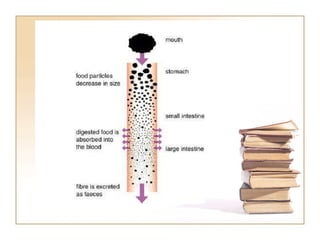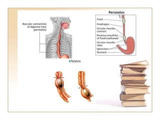 The document summarizes the journey of food through the digestive system. It begins with ingestion in the mouth, where teeth break down food and saliva begins digestion. Peristalsis then moves food to the stomach for mixing with acids and enzymes. Digestion continues in the small intestine where nutrients are absorbed into the bloodstream. Undigested waste then moves to the large intestine where water is absorbed before waste is expelled through the anus.