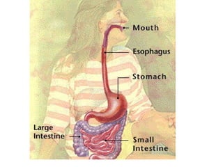 The digestive system breaks down food and extracts nutrients. Food passes through the mouth, esophagus, stomach, small intestine where nutrients are absorbed, and large intestine where water is removed before waste exits the body. The excretory system includes kidneys which remove waste from the blood to be stored in the bladder and later expelled as urine.