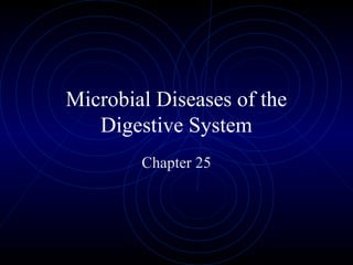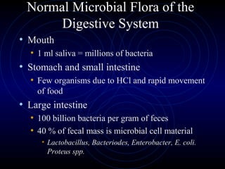 This document summarizes microbial diseases of the digestive system. It discusses the normal microbial flora of the mouth, stomach, small intestine, and large intestine. It then covers various bacterial diseases of the lower GI tract caused by infections and intoxications. Specific diseases covered include Campylobacter gastroenteritis, Escherichia gastroenteritis, Shigellosis, Salmonellosis, Typhoid Fever, Cholera, Staphylococcal food poisoning, and Peptic ulcers. It also summarizes viral Hepatitis A, B, C, D, and E.