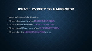 The document summarizes the key parts and functions of the digestive system. It begins with the mouth, then describes the esophagus, stomach, small intestine, large intestine, rectum and anus. The small intestine absorbs nutrients from food while the large intestine absorbs water and forms feces. Accessory organs that help with digestion include the liver, which produces bile, the pancreas which produces enzymes and insulin, and the gallbladder which stores bile.