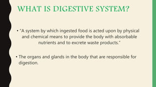 The digestive system breaks down ingested food into nutrients that can be absorbed and used by the body. It consists of the gastrointestinal tract including the mouth, esophagus, stomach, small and large intestines, and accessory organs like the liver, pancreas, and gallbladder. Food is ingested, mechanically and chemically broken down, absorbed in the small intestine, and waste is eliminated. The digestive system works through peristalsis, secretion of enzymes, and absorption of nutrients. Common digestive disorders include gastroenteritis, ulcers, appendicitis, hepatitis, and cirrhosis of the liver. Irritable bowel syndrome and constipation are also linked to mental health issues like depression and anxiety through the gut