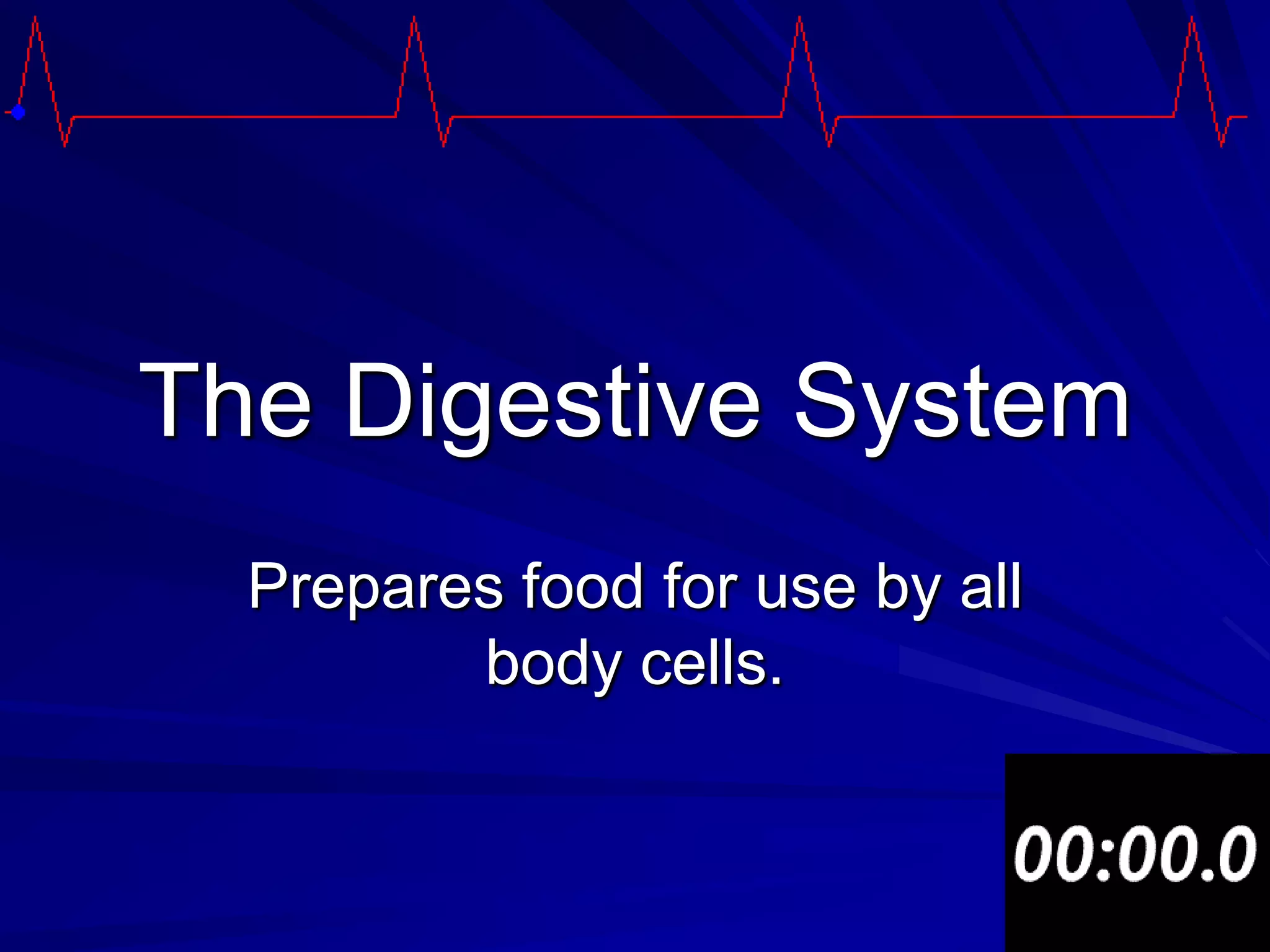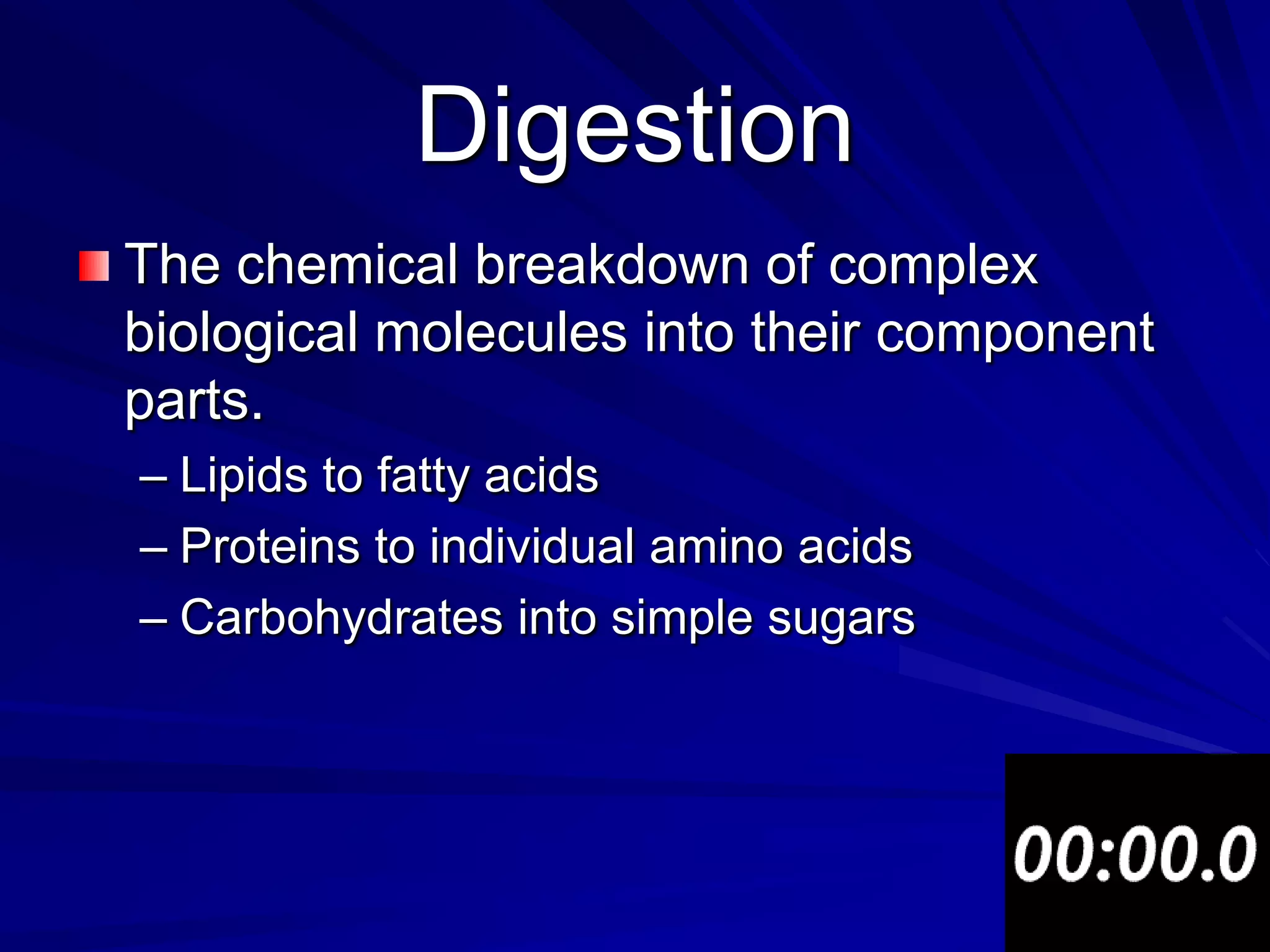 The digestive system breaks down food into smaller molecules that can be absorbed and used by the body. It begins with ingestion in the mouth and ends with waste excretion from the anus. Accessory organs like the liver, gallbladder and pancreas produce enzymes, bile and juices that aid in digestion as food passes through the esophagus, stomach, and small and large intestines where nutrients are absorbed and waste is eliminated.