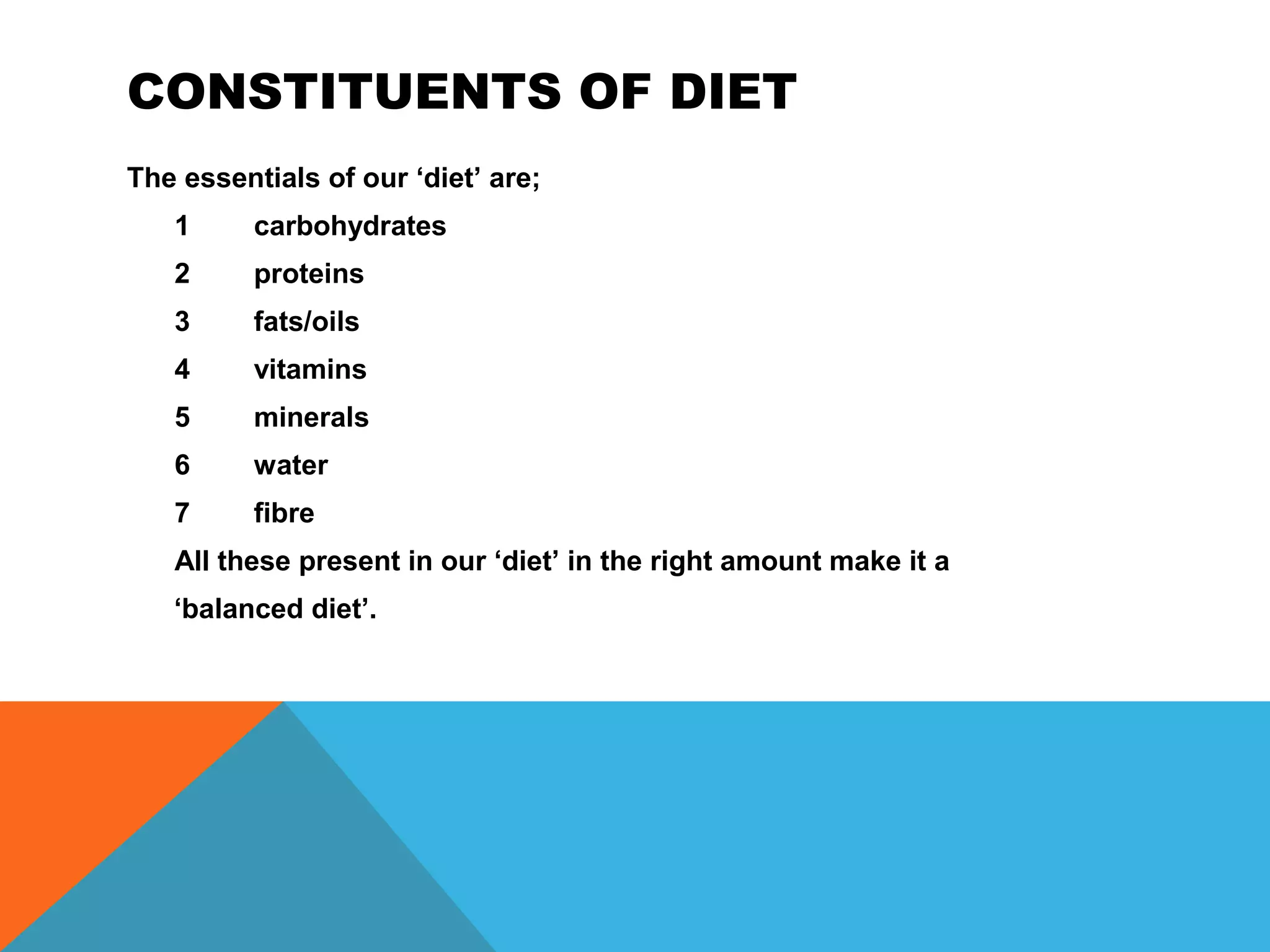 The document discusses the constituents of a balanced diet and the process of digestion. It lists the essential components of a diet as carbohydrates, proteins, fats, vitamins, minerals, water, and fiber. It then describes the role of the mouth, esophagus, stomach, small intestine, large intestine, liver, gallbladder, and pancreas in breaking down and absorbing food. The liver produces bile to help digest fats and filters toxins from the bloodstream, while the gallbladder stores and releases bile and the pancreas produces enzymes to digest nutrients and regulates blood sugar.