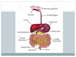 The human digestive system comprises the gastrointestinal tract and accessory organs, responsible for converting food into absorbable substances through processes like peristalsis. It includes the mouth, pharynx, esophagus, stomach, small intestine, and large intestine, each with specific functions in digestion and absorption. Key processes involve secretion of enzymes and hormones, mechanical and chemical digestion, and absorption of nutrients, along with the elimination of waste.