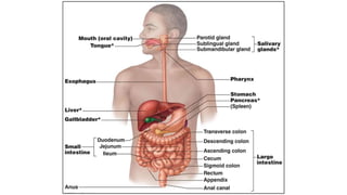 The document provides a comprehensive overview of the human digestive system, explaining the necessity of digestion for energy use and the processes involved from ingestion to defecation. It details the roles of various organs and substances, such as the mouth, stomach, pancreas, liver, and small and large intestines, in breaking down food into usable nutrients. Additionally, it highlights the specific enzymes and stages involved in digestion, as well as the absorption of essential vitamins and the final formation of feces.