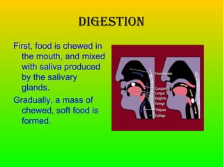 The document summarizes the stages of digestion, including chewing food in the mouth, food moving through the esophagus into the stomach where it mixes with gastric juices to form chyme, and finally the chyme leaving the stomach and entering the small intestine where it mixes with juices from the intestine, pancreas, and liver to separate out all the substances needed. The liver is noted as the only organ able to regenerate itself, allowing part of one person's liver to be donated to another.