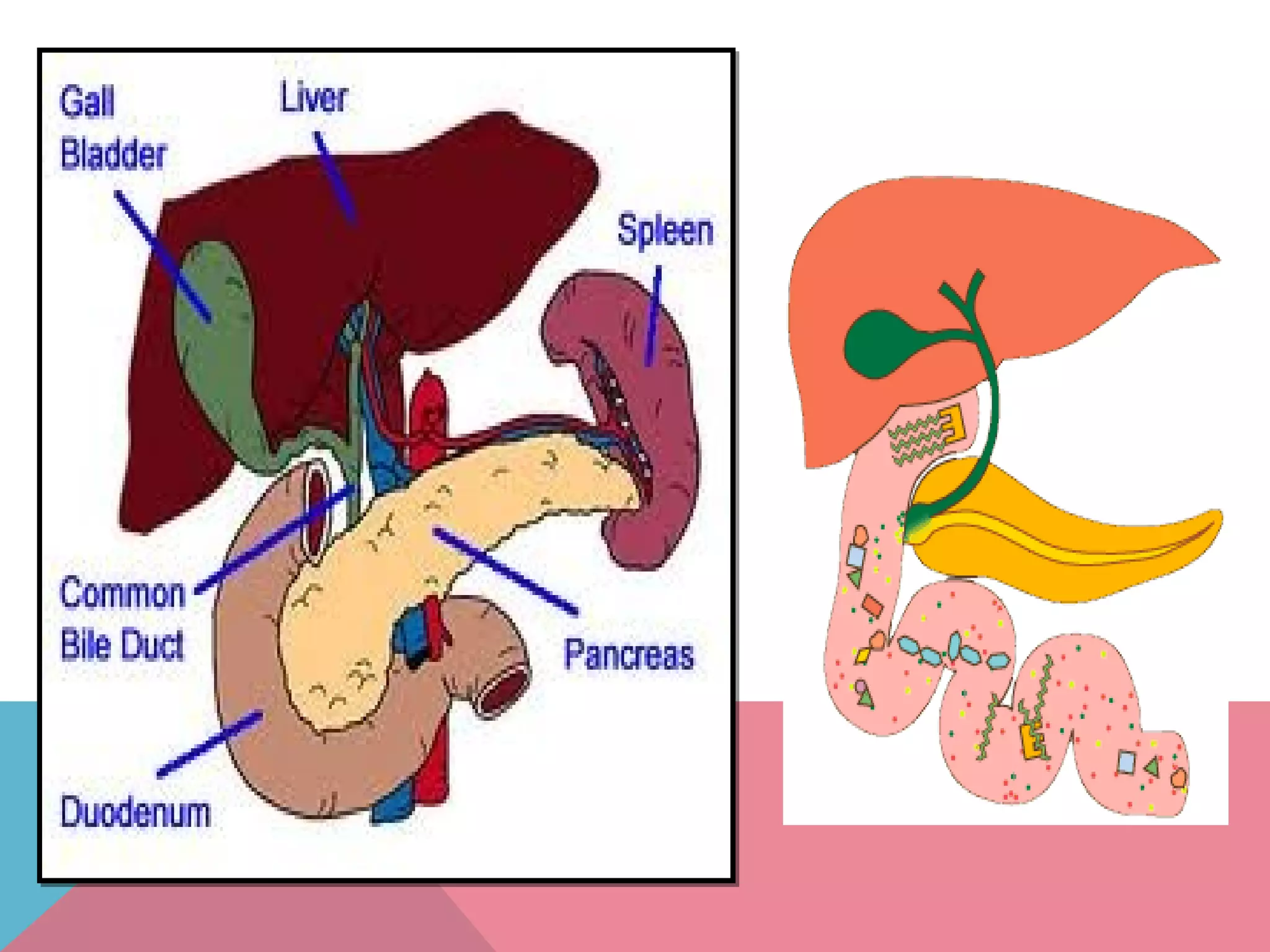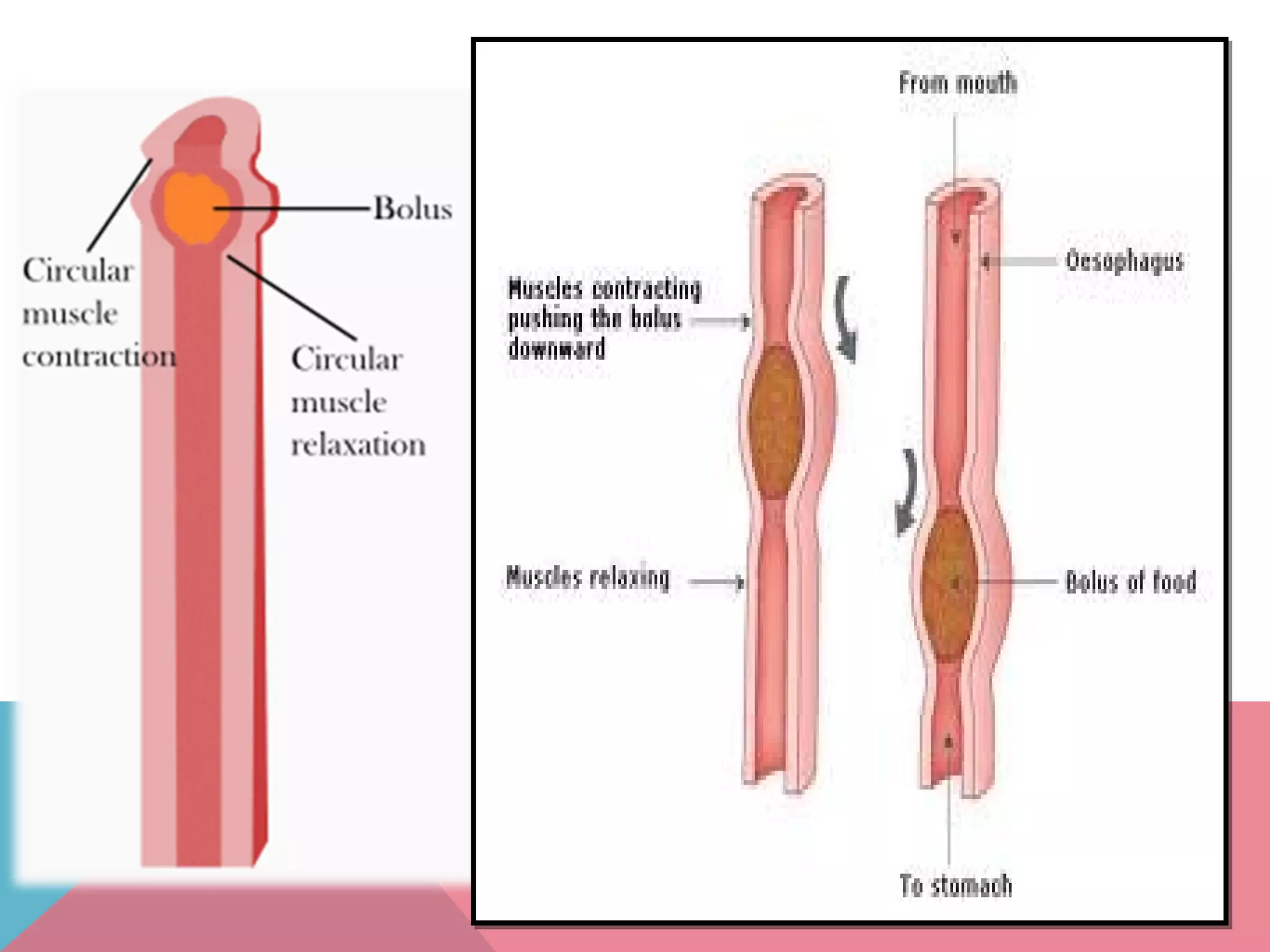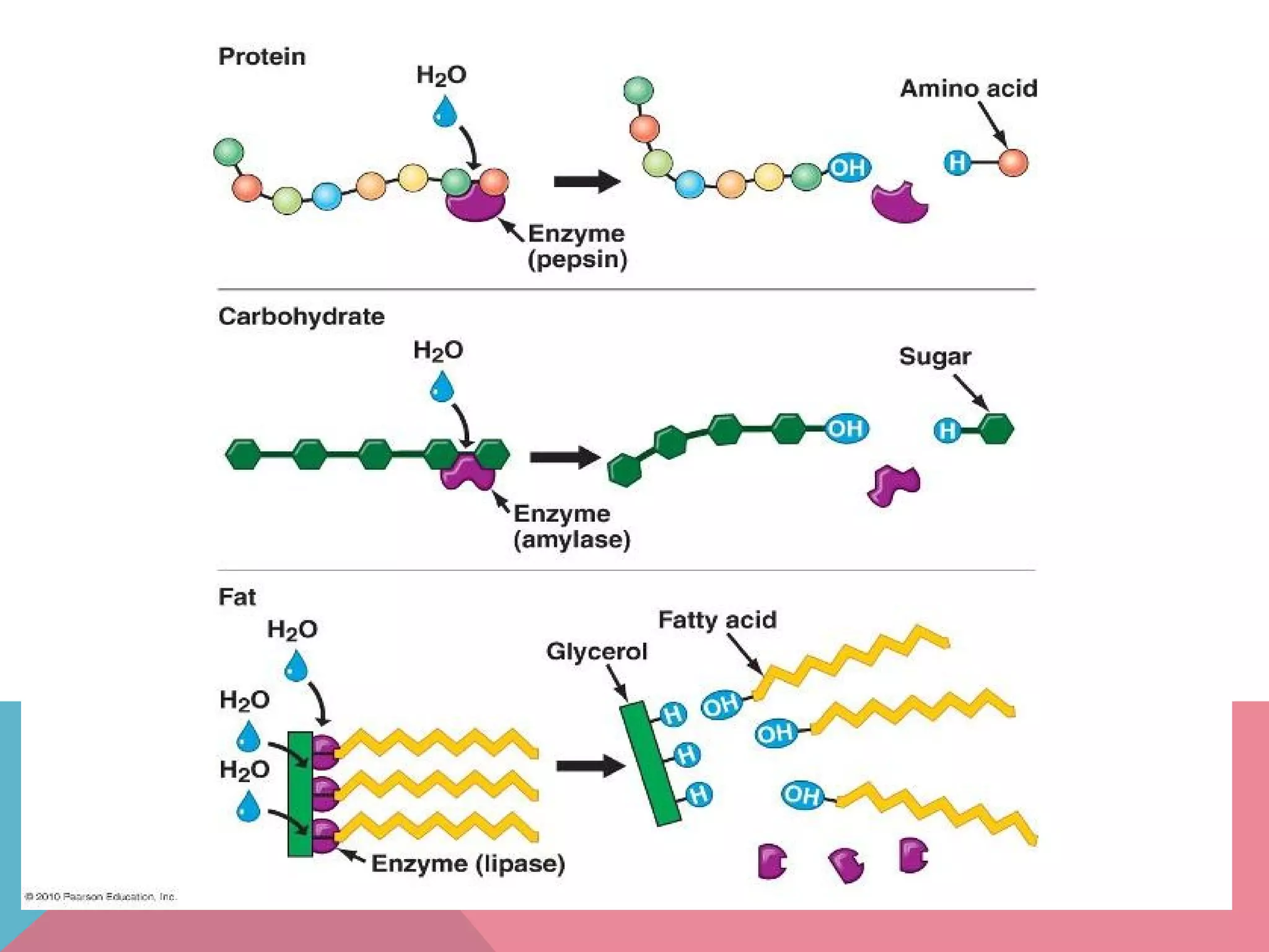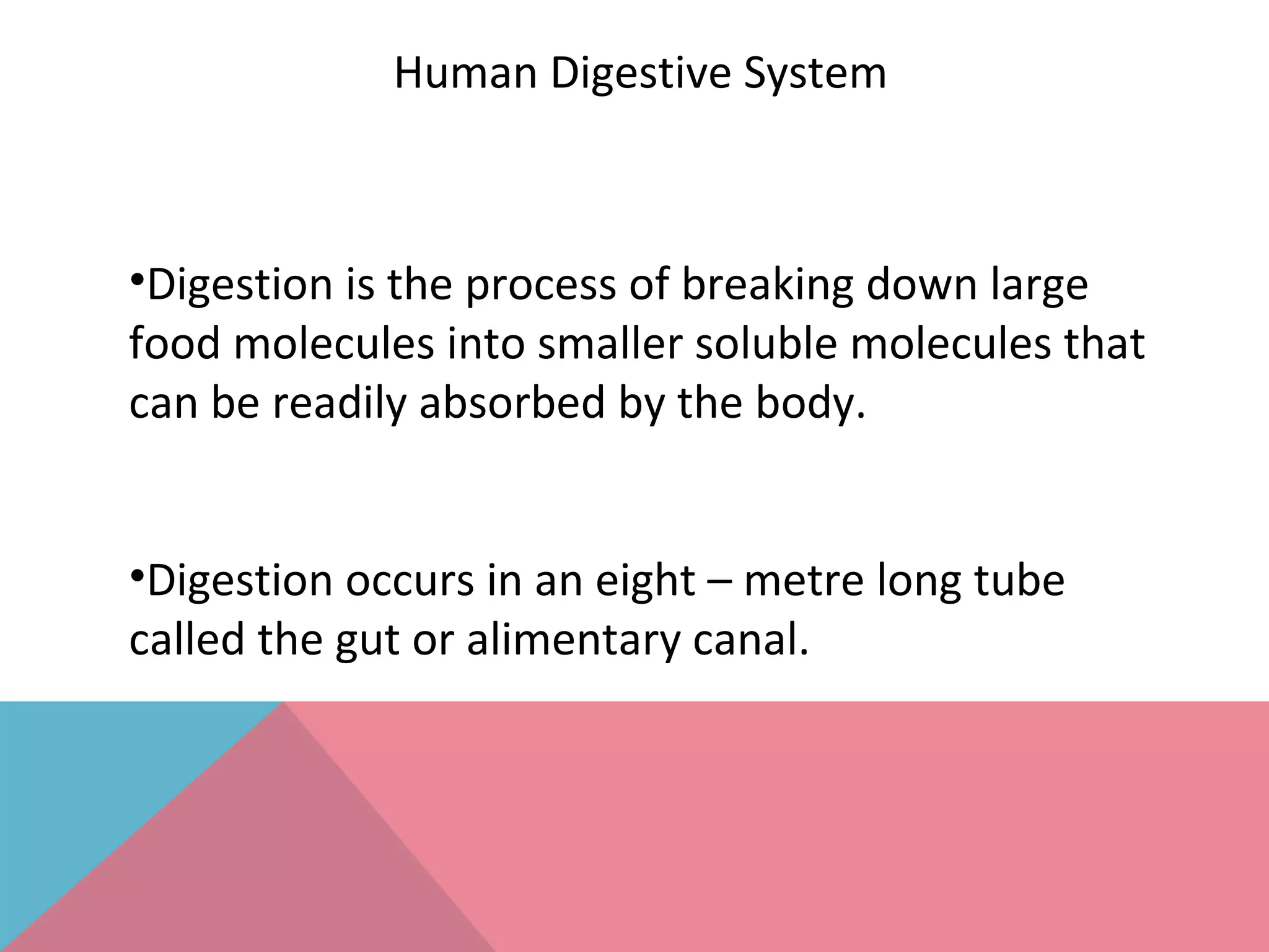 The human digestive system breaks down food through physical and chemical digestion. Physical digestion involves chewing and stomach churning while chemical digestion uses enzymes to break foods into smaller molecules. Digestion begins in the mouth and travels through the esophagus, stomach, and small and large intestines. In each section, glands secrete enzymes to break down carbohydrates, proteins, and fats into smaller molecules like glucose, amino acids, and fatty acids that the body can absorb.