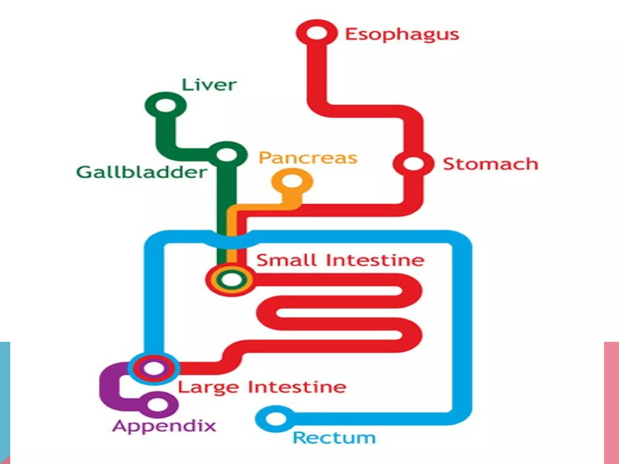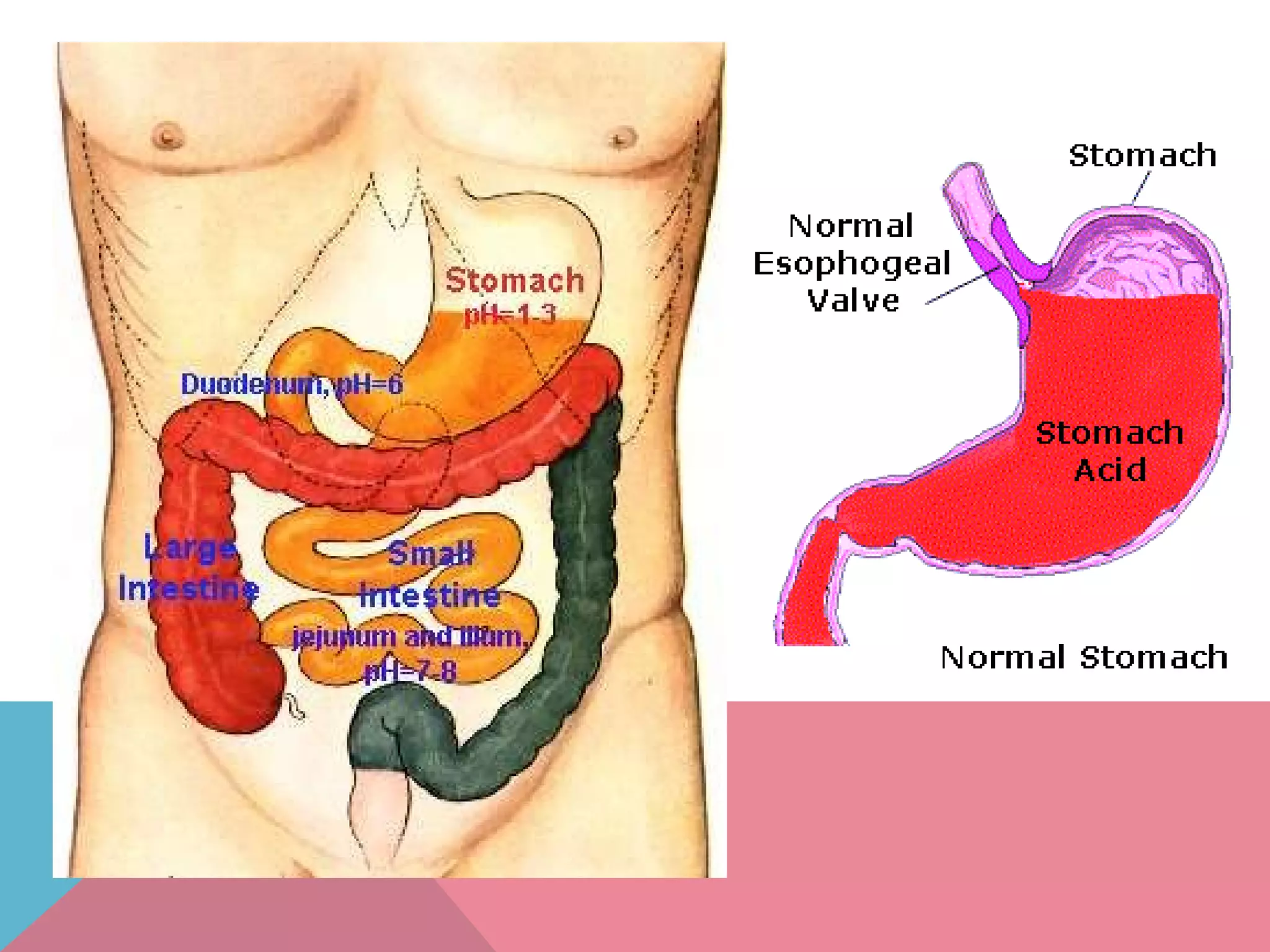 The human digestive system breaks down food through physical and chemical digestion. Physical digestion involves chewing and stomach churning while chemical digestion uses enzymes to break foods into smaller molecules. Digestion begins in the mouth and travels through the esophagus, stomach, and small and large intestines. In each section, glands secrete enzymes to break down carbohydrates, proteins, and fats into smaller molecules like glucose, amino acids, and fatty acids that the body can absorb.