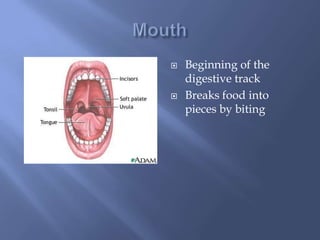 The digestive system begins with the mouth, which breaks food into pieces through biting. The esophagus then transports food to the stomach, which processes and holds food as it is broken down by enzymes. The small intestine is responsible for absorbing nutrients from food into the bloodstream and passing waste to the large intestine, which collects and processes undigested matter into feces. The pancreas, liver, and other organs aid in digestion by producing enzymes and filtering waste products from the blood.