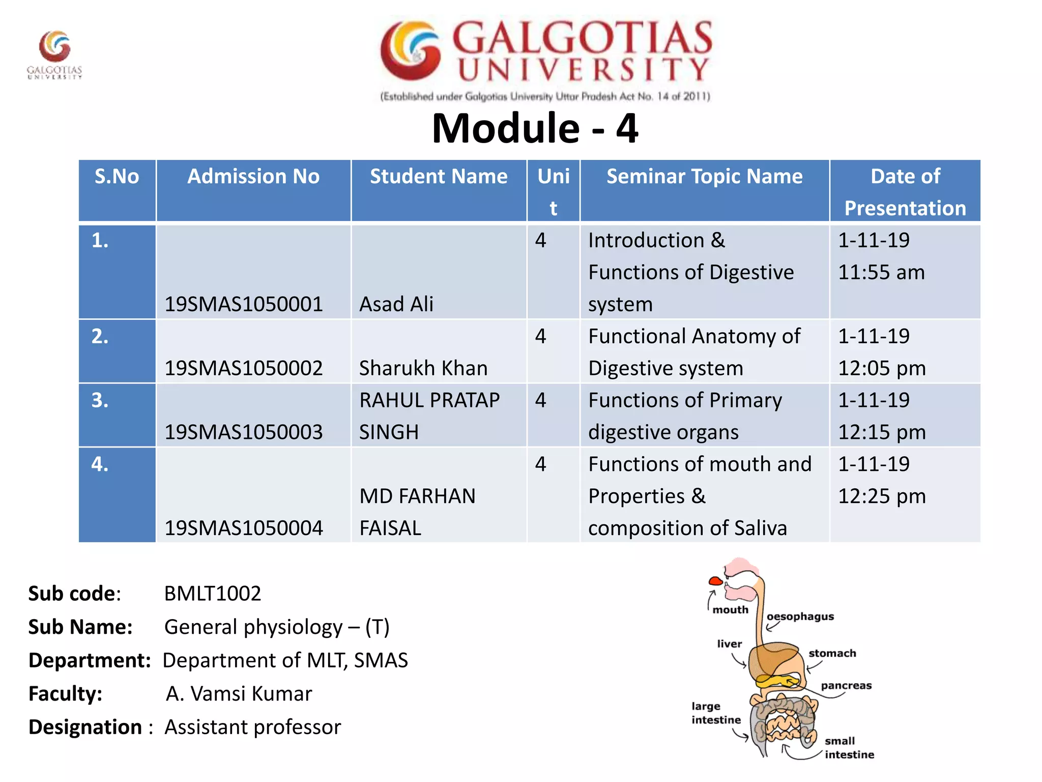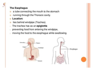 1. The document discusses a seminar on the digestive system, listing 4 students who presented on topics related to the digestive system, including the introduction and functions, functional anatomy, functions of primary digestive organs, and the functions of the mouth and properties of saliva.