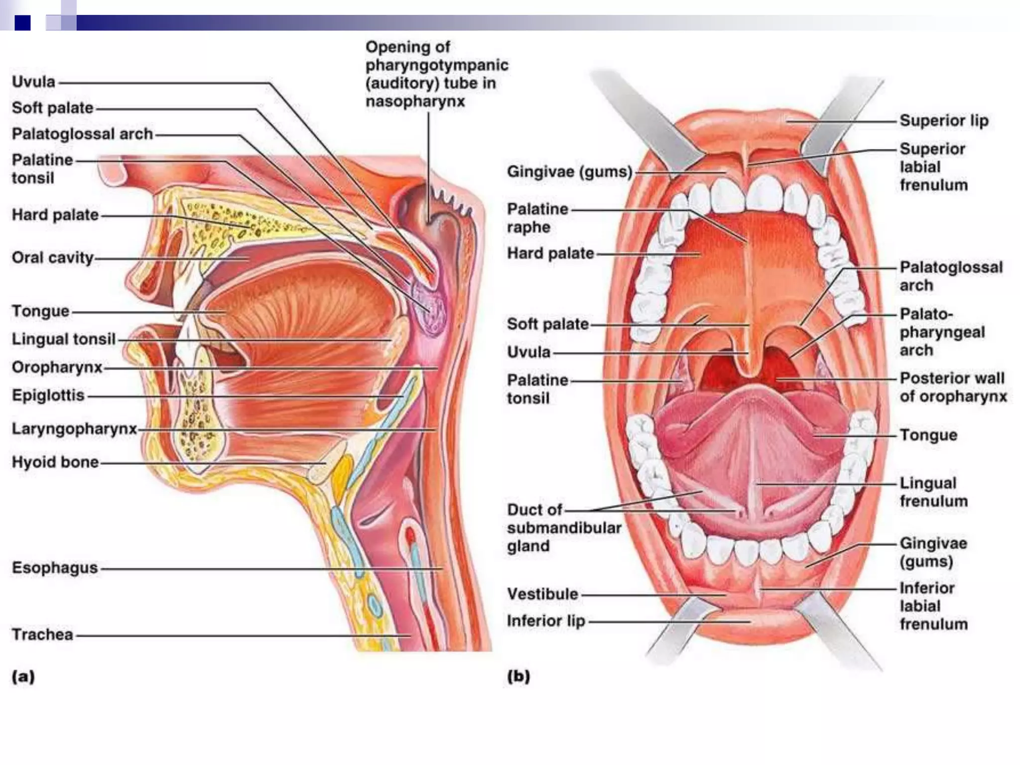 The digestive system consists of the alimentary canal and accessory organs. The alimentary canal includes the mouth, pharynx, esophagus, stomach, small intestine, and large intestine. Accessory organs include the teeth, tongue, liver, gallbladder, and pancreas. Food is ingested and moves through the digestive tract, where it undergoes mechanical and chemical digestion to break nutrients into smaller molecules that can be absorbed and used by the body. Enzymes produced in glands aid in digestion at different points along the tract.