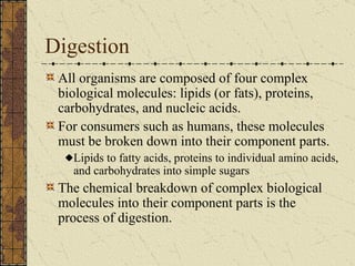 The document summarizes the key parts and functions of the human digestive system. It describes how the digestive system breaks down complex molecules like lipids, proteins, and carbohydrates into smaller components that can be absorbed and used by the body. The main parts of the digestive system include the mouth, esophagus, stomach, small intestine, large intestine, and accessory organs like the liver and pancreas. Enzymes play an important role in digestion by breaking down molecules.