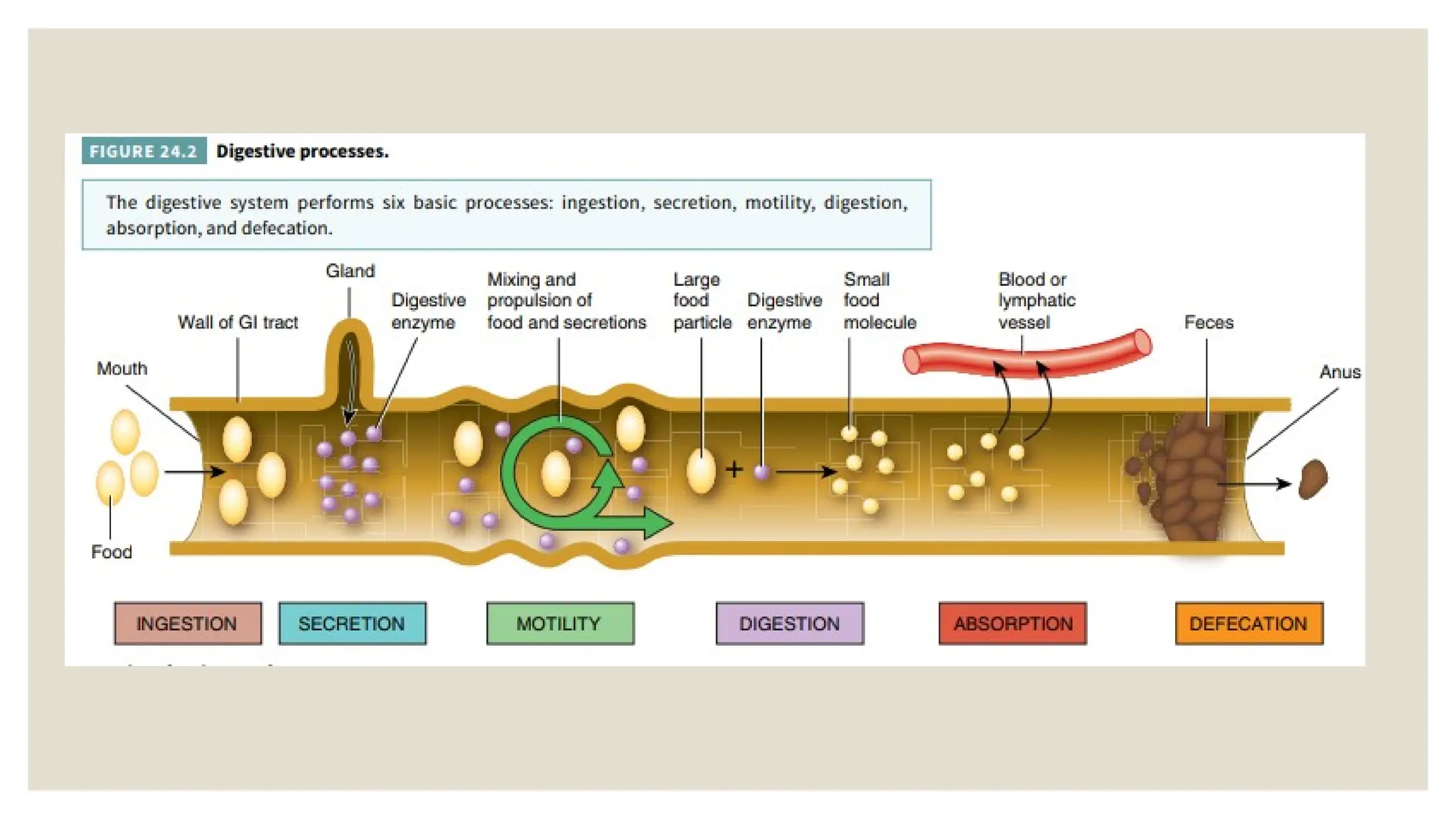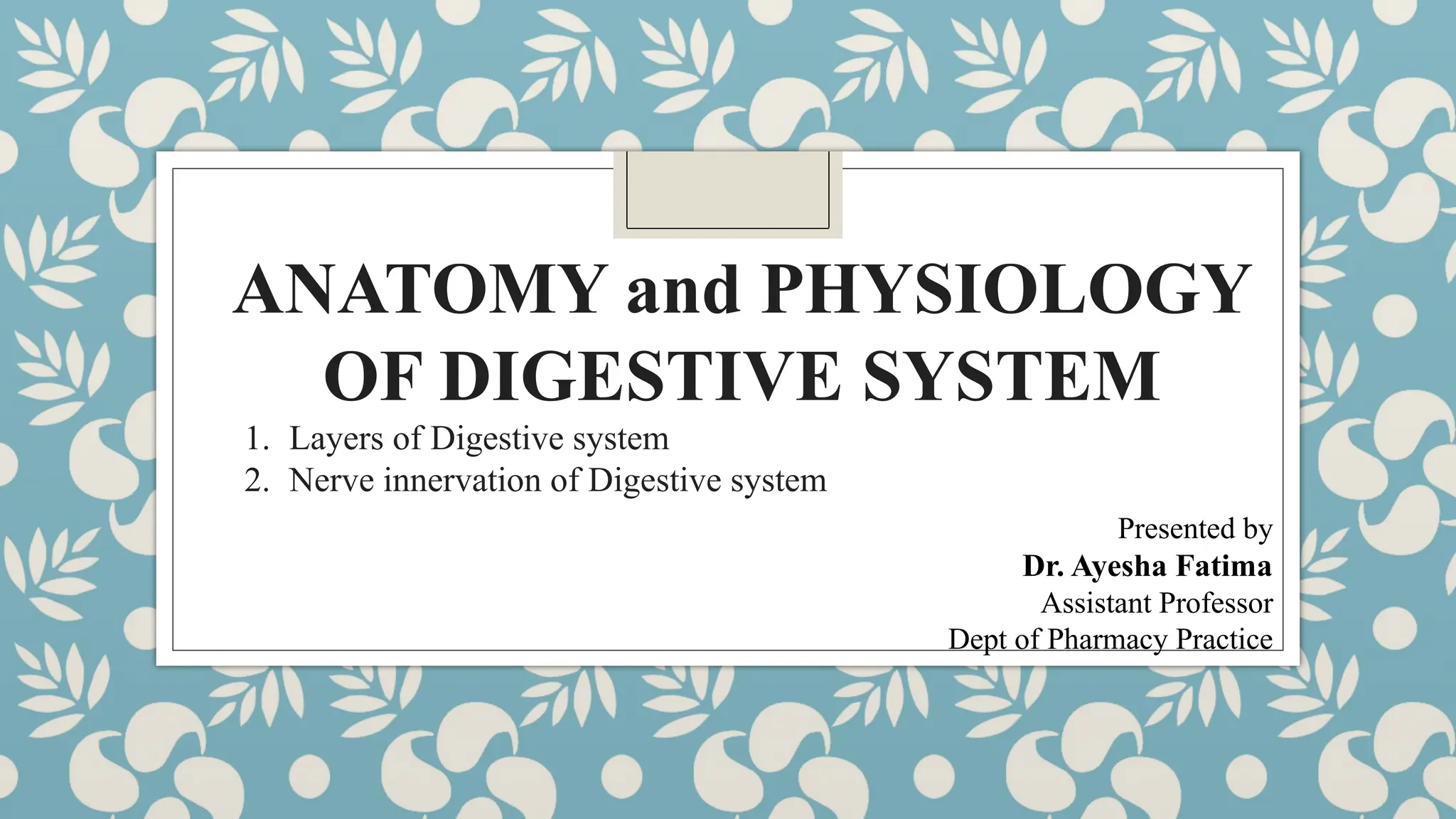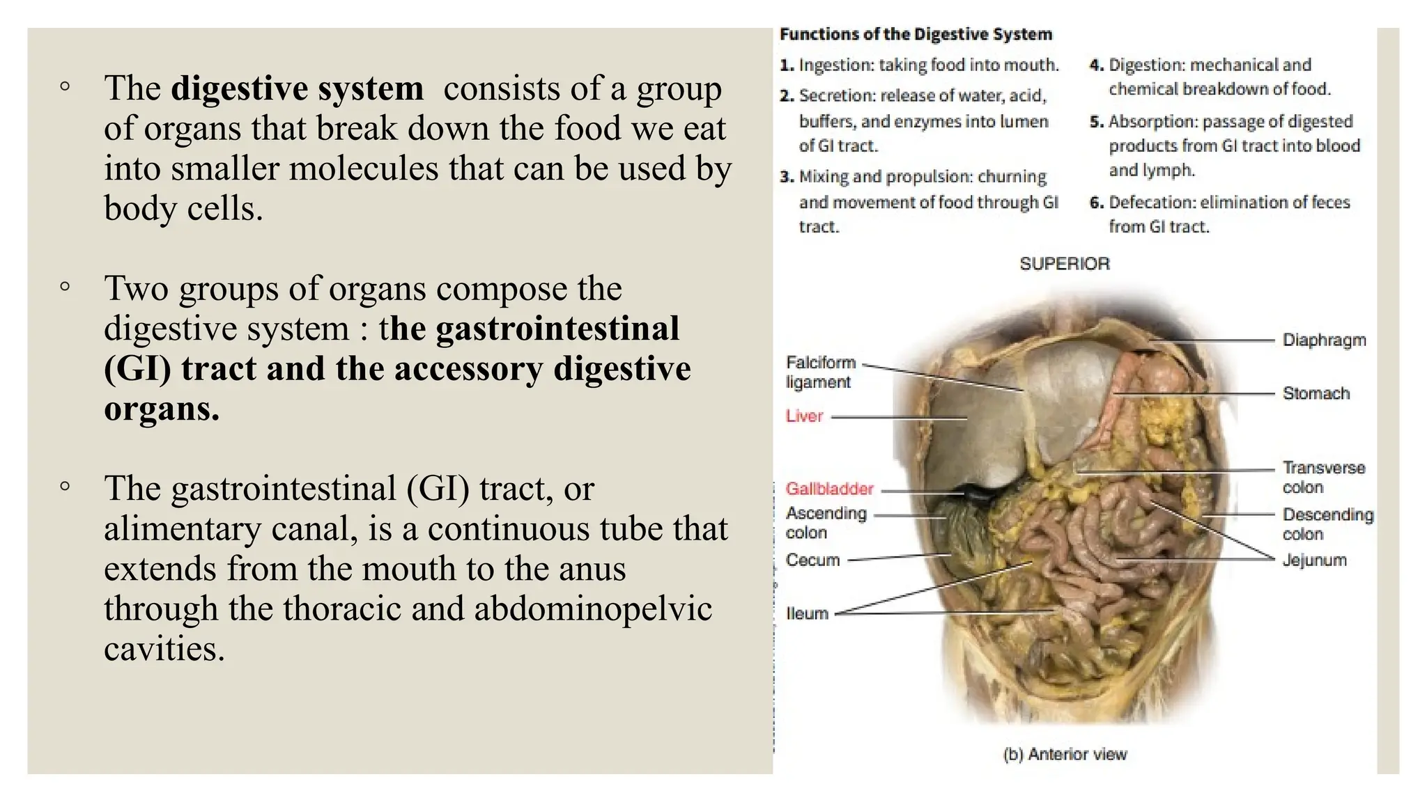 The document provides a comprehensive overview of the anatomy and physiology of the digestive system, outlining the structure and functions of the gastrointestinal (GI) tract and accessory digestive organs. It details the digestive processes including ingestion, secretion, motility, digestion, absorption, and defecation, along with the four-layered arrangement of tissues in the GI tract and the neural innervation by the enteric nervous system. Additionally, the document discusses the effects of the autonomic nervous system on GI tract functions and the reflex pathways that regulate digestive processes.