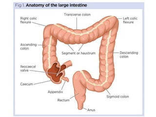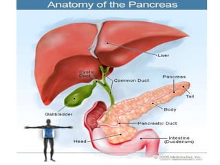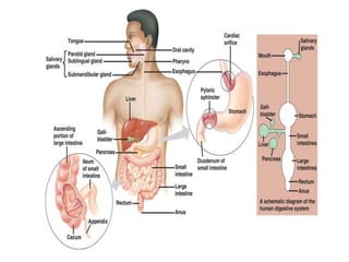 The digestive system breaks down food into smaller molecules that can be absorbed and used by the body. It consists of the digestive tract, including the mouth, esophagus, stomach, small intestine, large intestine, liver, gallbladder and pancreas. Digestion involves both mechanical and chemical breakdown of food. Enzymes produced in the mouth, stomach, pancreas and small intestine aid in digestion before nutrients are absorbed in the small intestine. Undigested material then moves to the large intestine to be excreted.
