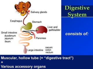 The document outlines the anatomy and functions of the digestive system, detailing the roles of various organs from ingestion to excretion. It describes the digestive tract's structure, including its four layers and essential components like teeth, salivary glands, and the stomach, while emphasizing the significance of each part in processing food. Additionally, it highlights the regions of the small and large intestines, the importance of surface area for absorption, and the histological features that facilitate digestion.
