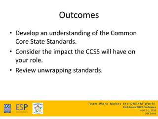 This document outlines a presentation on the Common Core State Standards given at the 33rd Annual NRCP Conference on April 1-3, 2016 in Oak Brook. The presentation provides an overview of the CCSS, including what they are and are not, how they are organized, instructional shifts, and how to unwrap standards. It encourages attendees to select a standard and consider different methods for teaching it to reach all learners. Contact information is provided for follow up questions.