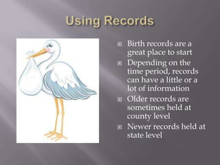 The document provides an overview of various records useful for genealogical research, including birth, marriage, death, and military records, and their significance in tracing family history. It outlines the types of information available in these records, such as names, dates, and relationships, and offers guidance on where to find these records. Additionally, it mentions lesser-used sources that could aid in research, emphasizing the importance of exploring a variety of documentation to connect with ancestors.