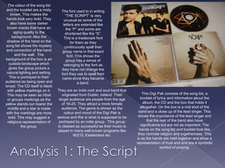 This Digi Pak consists of a song list, booklet, and CD for the band The Script. The background landscape gives the group picture a natural setting, portraying them as open. Markings on the black CD may suggest religious or tribal symbols. The unusual trademark font used for the band's name shows their sense of belonging. The hands on the front connote togetherness and religion.