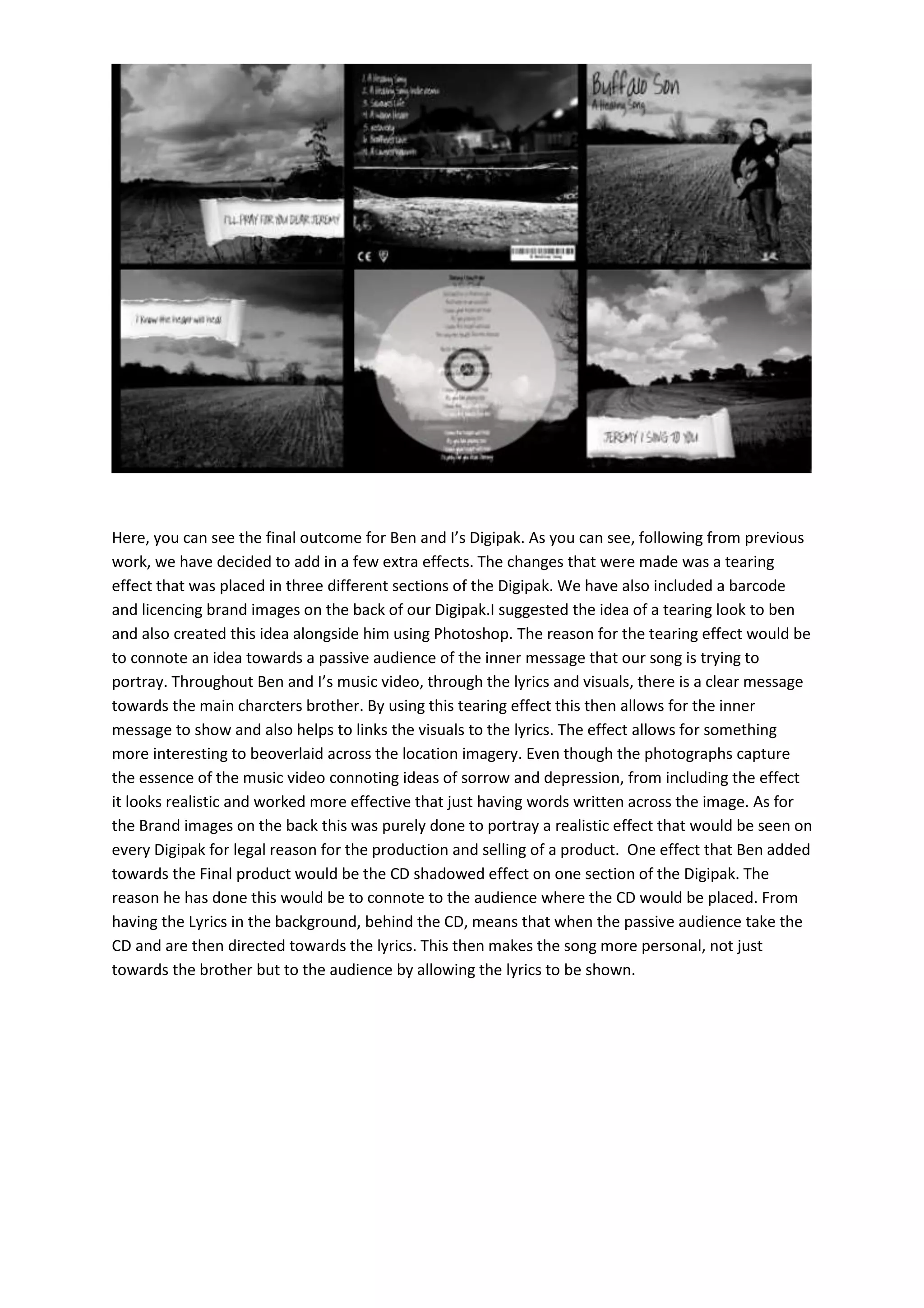 This document describes changes made to a Digipak design for a song. A tearing effect was added to three sections to convey the inner message about sorrow and depression portrayed in the song's lyrics and music video. A barcode and branding images were also included on the back page to make the design look like a realistic commercial product. A shadow effect under one section indicates where the CD would be placed and helps direct the audience to the lyrics to make the song's message more personal to them.