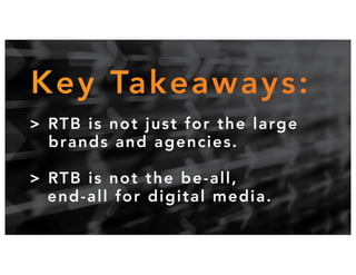 The document discusses the relevance of real-time bidding (RTB) in digital advertising for small and medium brands and notes that RTB is not exclusive to large brands. It includes statistics on market budgets and conversion rates for various U.S. cities in 2013, indicating the importance of RTB as part of an overall marketing strategy. The content emphasizes that RTB should be integrated as a tactical element within broader digital buying efforts.