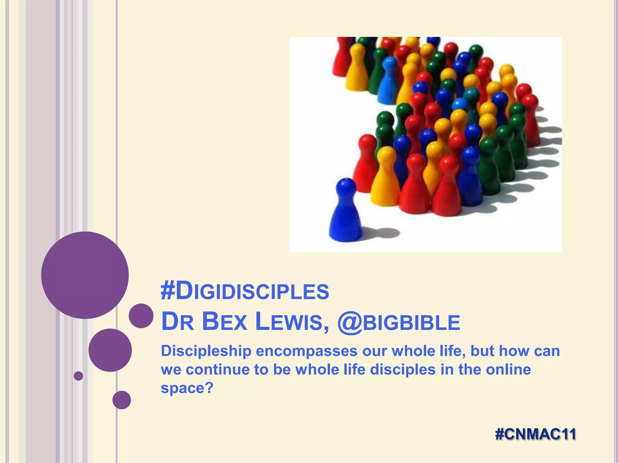 The document discusses the concept of being a 'digital disciple', emphasizing the importance of living out Christian faith in online spaces while maintaining authenticity and engagement with others. It highlights the various digital environments, like social media, and how they shape interactions and community in a spiritual context. The text encourages Christians to reflect on their online presence and values, fostering meaningful relationships both in virtual and physical spaces.