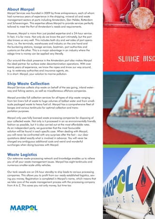Marpol Services was founded in 2009 by experienced entrepreneurs in shipping, oil, and waste management. They provide 24/7 maritime waste collection, transport, and ship cleaning services, as well as oil spill response. Their expertise and long experience working in ports like Amsterdam allow them to offer tailored solutions to marine pollution problems.