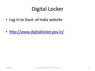 Digital Locker is an online platform for storing documents securely, accessible through the government of India website. Users can log in using their Aadhaar, upload documents, and verify details without needing physical copies. It will eventually allow direct uploads of certificates and records from government departments, making document management more efficient and free of charge.