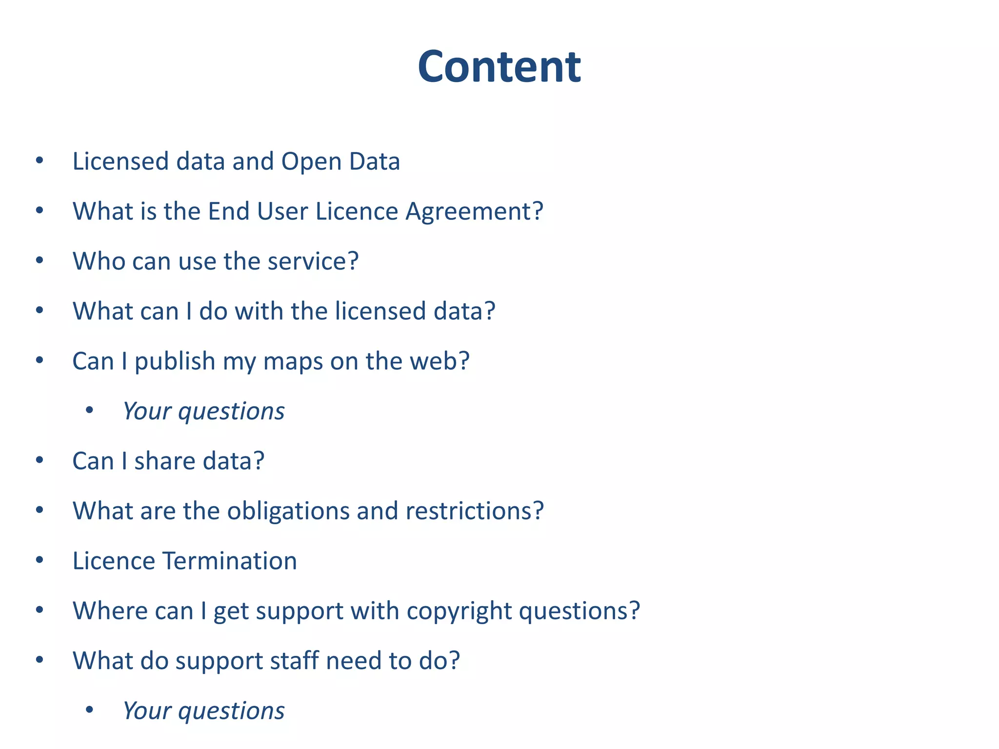The document outlines the copyright information and terms of use for the Digimap Ordnance Survey collection as of April 1, 2015, detailing the end user license agreement (EULA) which governs access and usage of licensed data. It includes guidelines on who can use the service, permissible uses, obligations, restrictions, and procedures for sharing and publishing maps. Key points include that the data is for educational use, details on the licensing structure, and that unauthorized sharing or commercial use is prohibited.
