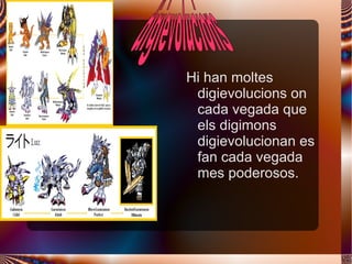 Hi han moltesdigievolucions on cada vegada que els digimons digievolucionan es fan cada vegada mes poderosos. digievolucions - 3.
