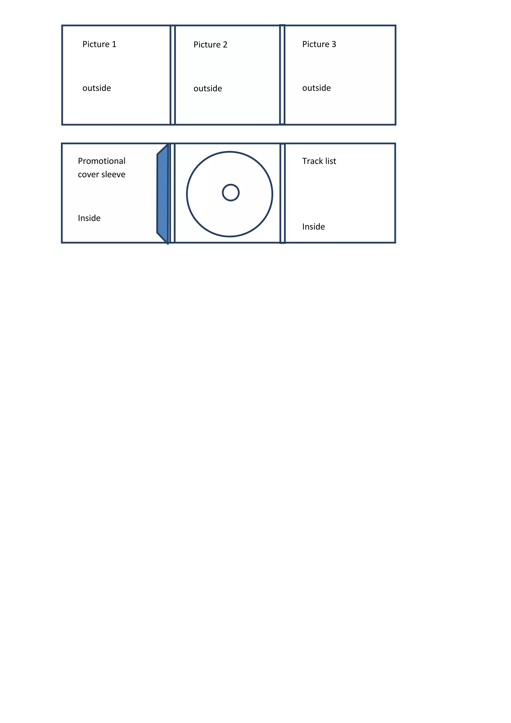 This document contains 3 pictures labeled outside, with a promotional cover sleeve and track list inside. The pictures are unlabeled and there is no other context provided about the content or purpose of the document.