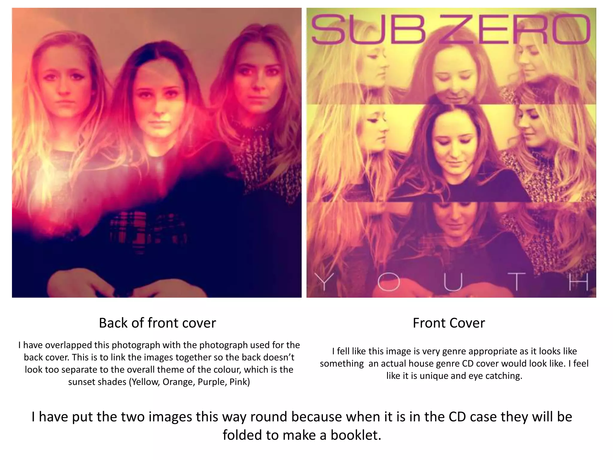 This document summarizes the design choices for a mock CD package. It discusses using overlapping photos on the front and back covers to link the images and theme. Audience research showed the most popular band name was "Sub Zero" and song title was "Youth". The booklet will include song lyrics. The CD and CD holder background will feature the same camouflage image so the CD blends in. The spine uses a cutout from the holder image for visual interest when the case is closed.