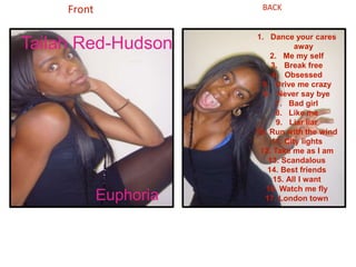 This document appears to be a track listing for an album containing 20 songs by the artist Tailah Red-Hudson. The songs cover a range of themes from dancing away cares, to flying high and feeling euphoric, to relationships and self-reflection. The track listing provides the titles of the songs but no other details about the album.