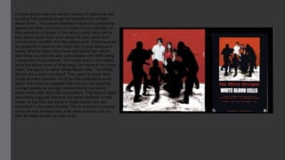 The document analyzes a digipack for an album by The White Stripes. It notes that the album cover uses a mixture of colors and poses of subjects dressed in black against white and red to convey an undertone of danger. Advertisements for positive reviews of the album from trusted music publications like NME and The Independent are also featured. As the band does not heavily advertise digitally, they seem to be targeting males aged 18-25 directly rather than younger audiences who rely more on social media, suggesting they are focusing on their existing fan base.