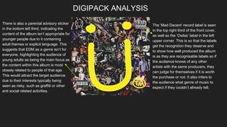 The digipack analysis summarizes the design elements of the album packaging for Jack U's album. The front cover features a bright yellow Jack U logo against a busy collage background, intended to stand out and be eye-catching. Throughout the packaging, the logo and collage theme are continued to maintain branding consistency. Production company logos and a parental advisory symbol are also included to provide relevant information to the target audience of young EDM fans.