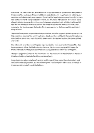The document provides an analysis of two digipack album designs. For the first album, the summary is: