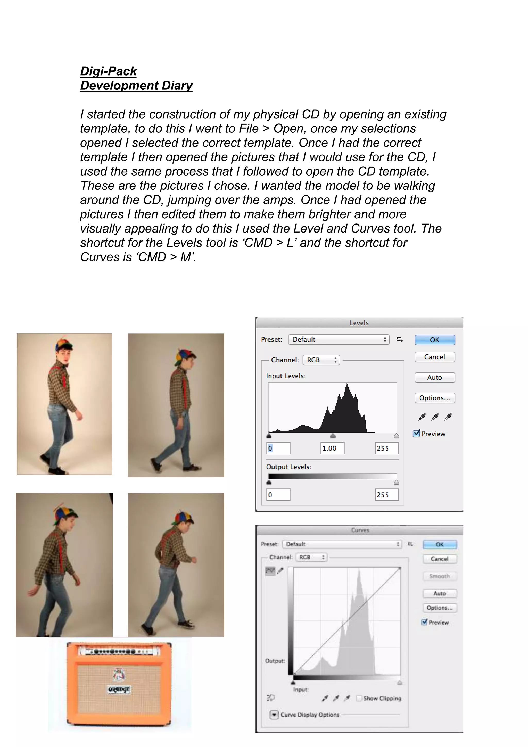 The document describes the process of creating a digipack for a CD. It involves opening templates, editing photos, placing elements like models and amps on the CD template, and adding design elements like lines and colors. The same process is followed for the inside cover, using photos edited with soft focus, color/tone adjustments, and filters. Text is then added. The front cover is a mashup created by scanning a hand-drawn design, outlining it, and adding color. An iPod is incorporated by selecting and pasting an album cover onto a photo. Finally, all elements are assembled into a digipack template.