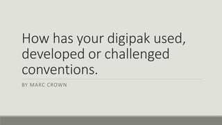 The document summarizes the design choices for a digipak album cover. It describes using individual images of band members on the front cover to help build recognition. Font, colors, and effects like a glass effect were chosen to represent the post-hardcore genre and attract fans. Inside, a graffiti background photo ties the theme together and credits are listed as is standard. Overall, conventions were challenged by focusing on building the band's image while representing their genre through visual elements.