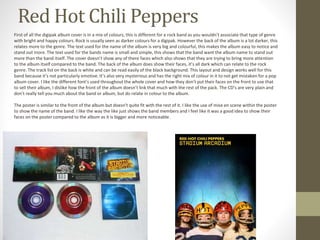 The document analyzes and summarizes the design elements of digipak album covers from four different artists: Red Hot Chili Peppers, AC/DC, Foo Fighters, and Emineh. For each album cover, key design elements like colors, images, text styles and placements are described. Comparisons are made between how the designs fit or diverge from conventions within their respective genres of rock or rap music. Overall impressions and opinions on what design aspects work well or could be improved are also provided.