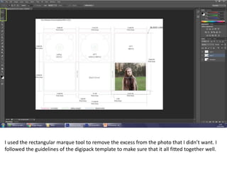 The document describes the steps taken to design a CD digipack template in a photo editing software. Key steps include: