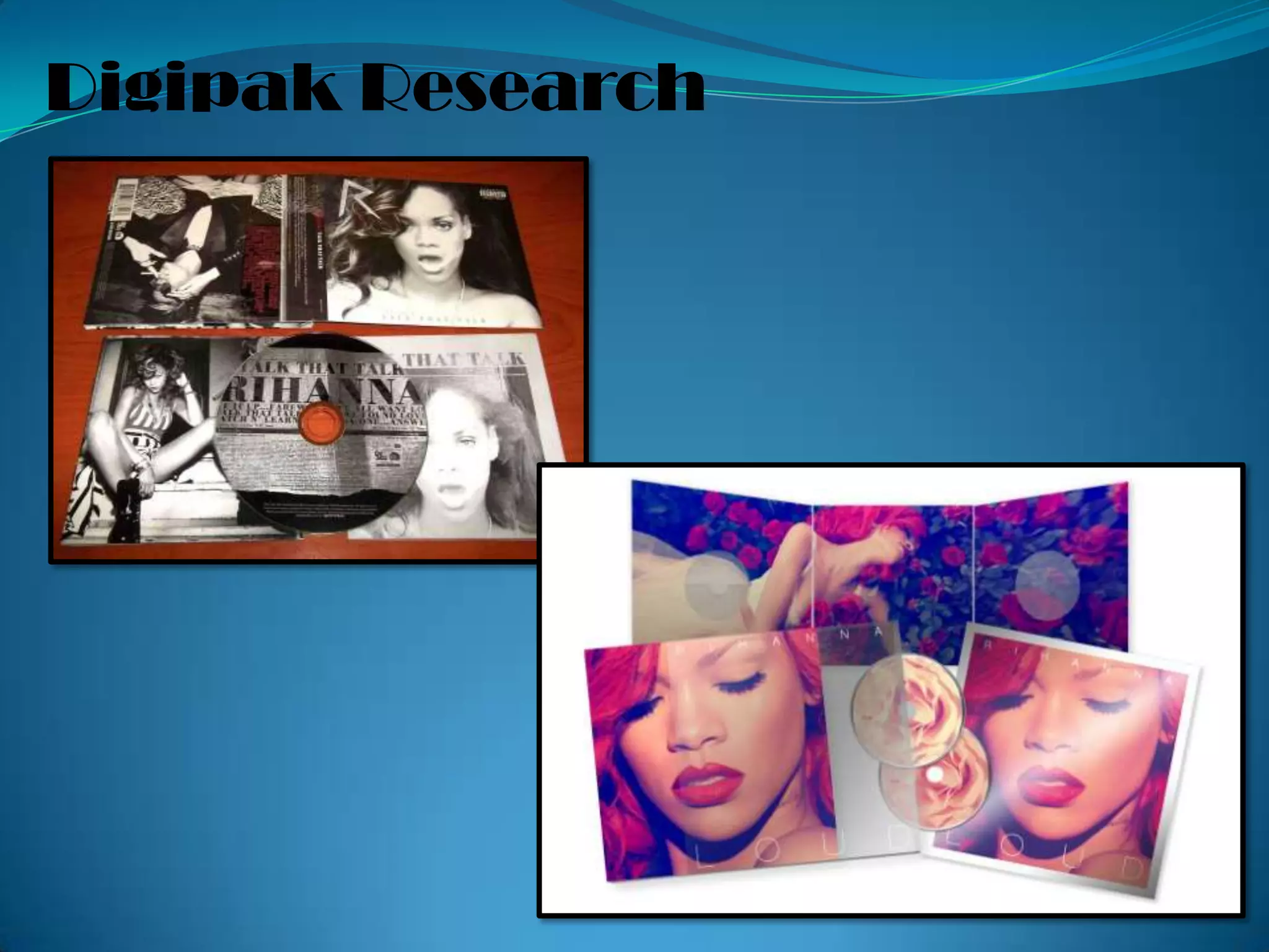 Digipaks are promotional packaging for albums that provide extra content beyond just the music. They typically include a CD along with additional materials like photos, lyrics, or DVDs in a folded cardboard design. Well-designed digipaks establish a consistent visual theme throughout and use imagery and symbols that relate to the artist's music or message, allowing fans a deeper connection to and understanding of the album. The author plans to create an original digipak with a cohesive theme to promote their own artist's music, video, and website.