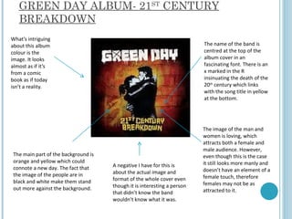 The document analyzes and summarizes three album covers: