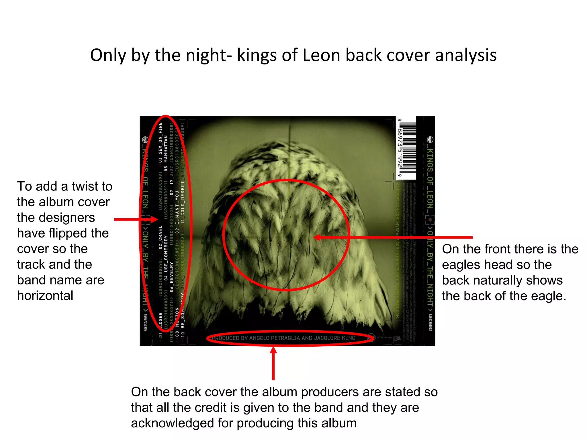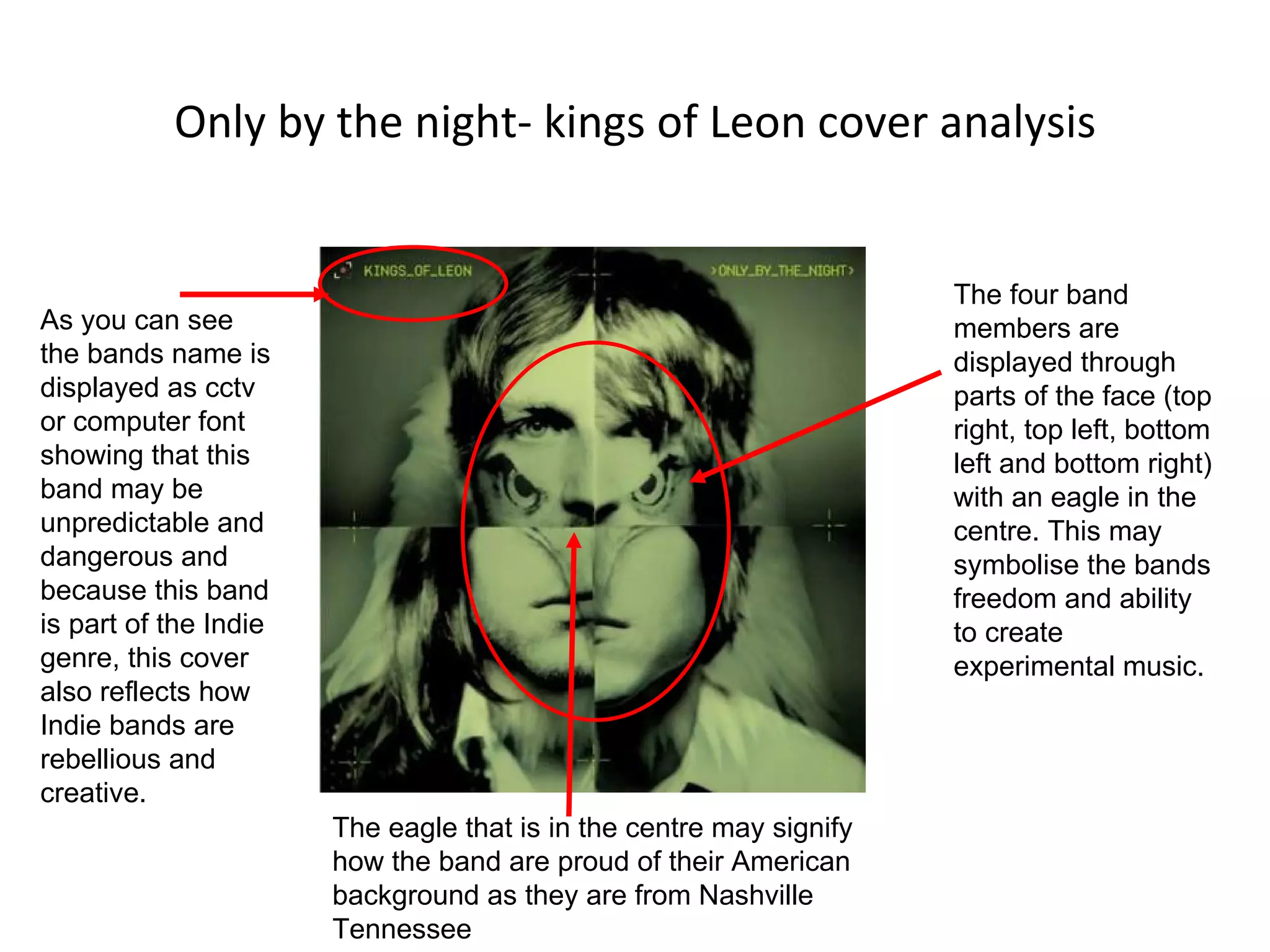 This document analyzes and summarizes the album covers of Only by the Night by Kings of Leon, Graduation by Kanye West, and Day and Age by The Killers. Key elements discussed include symbolism in the band members' faces and an eagle on Only by the Night, Kanye's graduation theme and riches represented by a bear on Graduation, and the contrast of day and age represented by the sun and ancient trees on Day and Age. Common conventions across album covers like track listings and crediting of producers are also addressed.