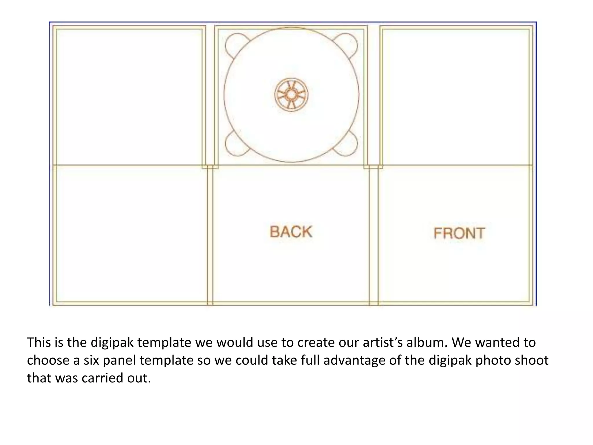 This document discusses template options for designing a digipak album cover. A six panel template was chosen to take advantage of photos from a photo shoot. The front cover photo features the artist with a shutter effect, leaving space for text. An interior photo shows the CD with a unique lens effect. The back photo leaves space for a track listing while showing the artist. Other panels may include simple artist shots or locations for text.