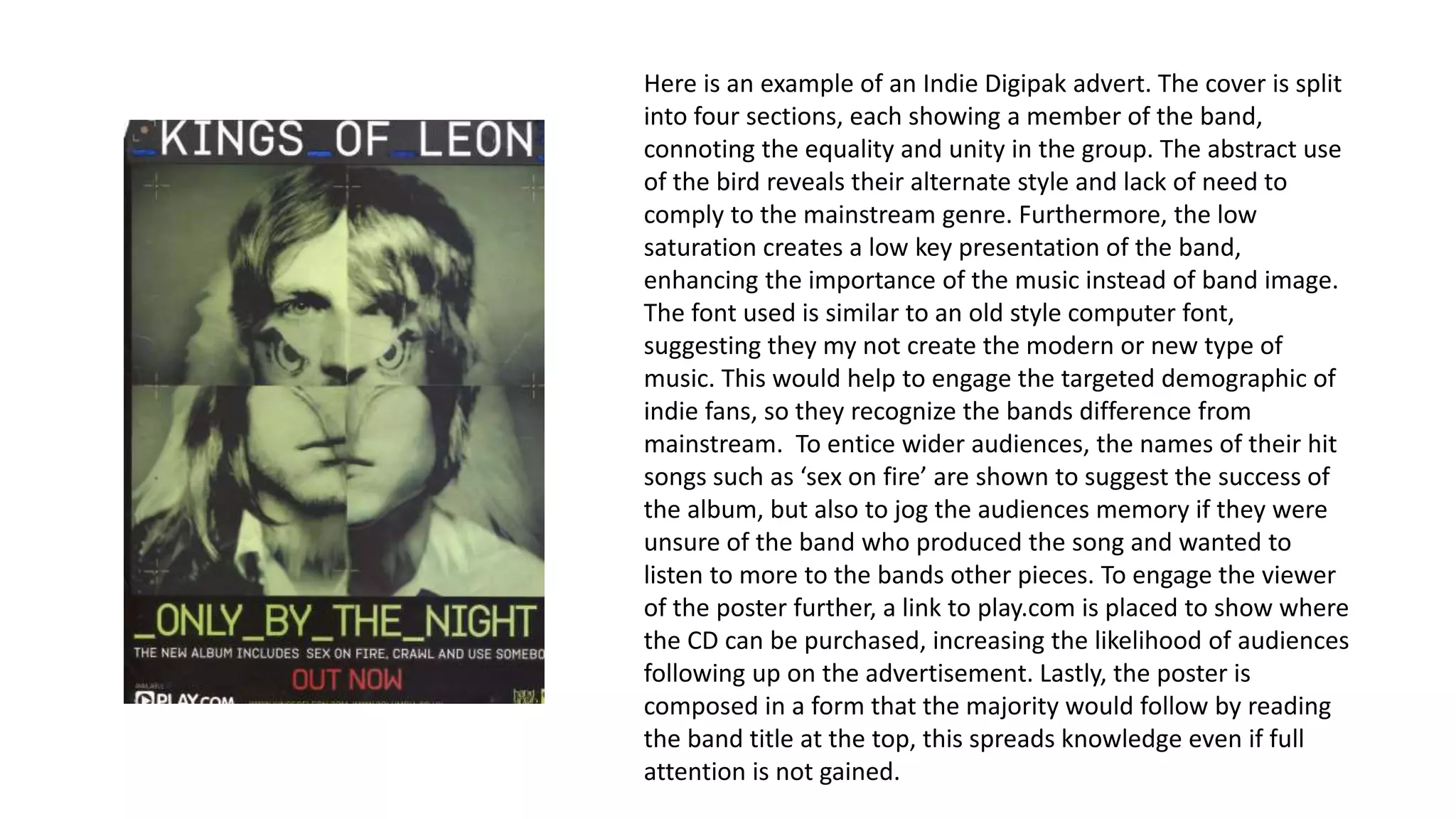 The document discusses several Indie digipak advertisements and how they convey information about the artist and target demographic through visual elements. Key points made include: