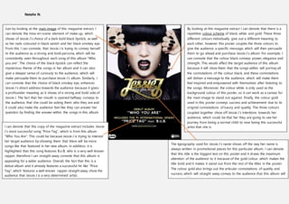 2) The color scheme of black, white, and gold symbolizes power, elegance, strength, success, and achievement. This sends the message that Jessie J has transformed from a normal child into a successful artist.