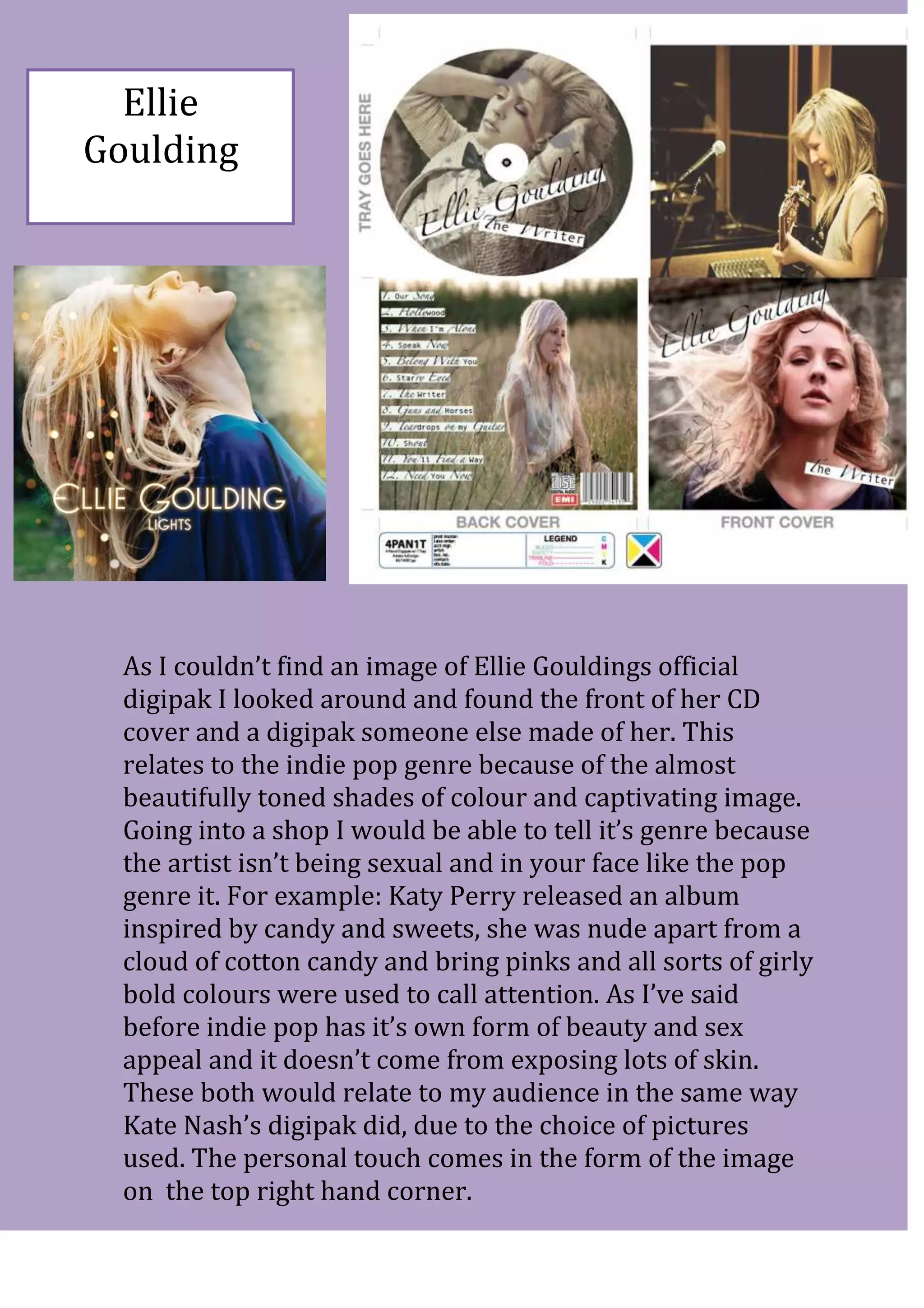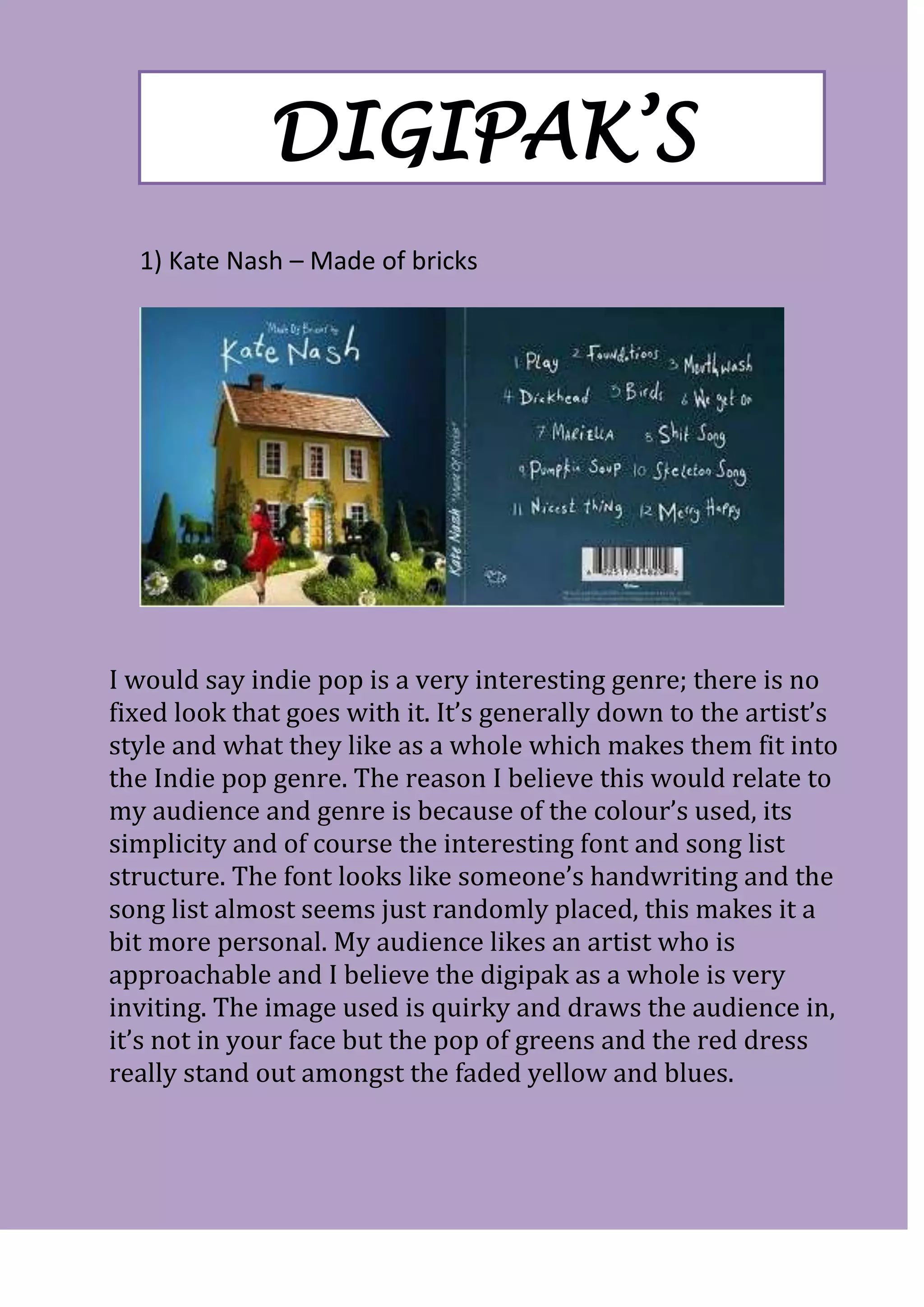 This document discusses and analyzes the digipak designs of three indie pop artists - Kate Nash, Ellie Goulding, and Florence + the Machine - in order to determine what design elements appeal to an indie pop audience. For each artist, the document examines the color palette, imagery, and overall aesthetic used in their digipak designs. Across all three designs, consistent elements identified include neutral and muted colors, artistic or quirky images of the artist, and incorporation of the album title into the visual design. These elements help identify the designs as indie pop and aim to attract that target audience through an unconventional and personal aesthetic approach.