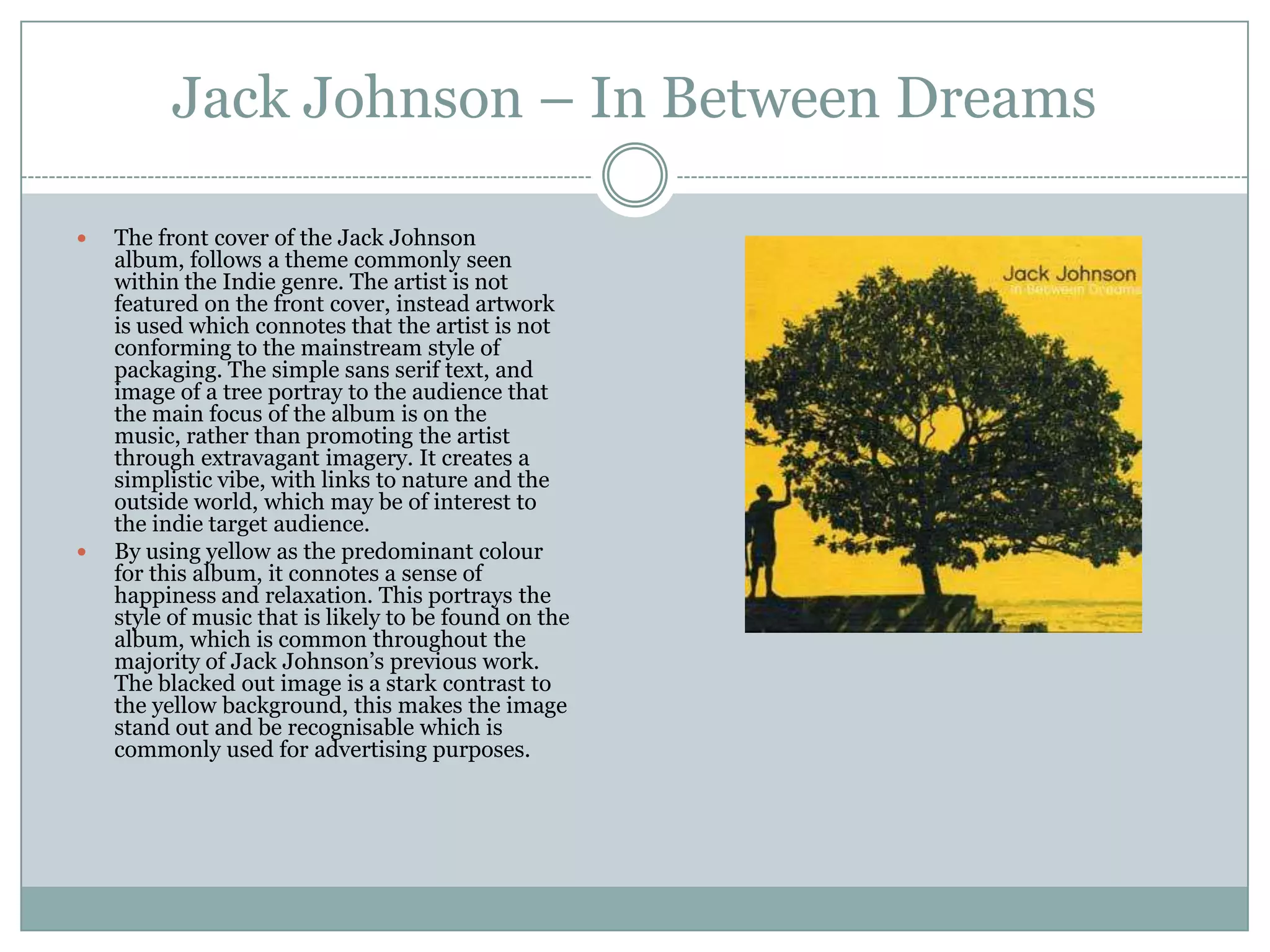 The digipak for Jack Johnson's album "In Between Dreams" utilizes simple, natural imagery and a minimalist design to portray a relaxed, casual style focused on the music rather than promoting the artist. Yellow is used to convey happiness and relaxation. On the inside, Johnson is casually dressed and slightly hidden, with the guitar in focus, continuing the theme of prioritizing the music. The digipak for Muse's album "The Resistance" also lacks photos of the band, instead using abstract artwork open to interpretation. Images of the band on the back are blurred and in run-down areas, conveying an artistic vibe without mainstream extravagance common to indie genres.