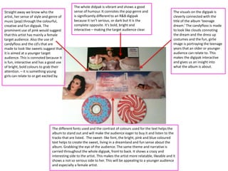 The document analyzes and summarizes the design of a music album's digipak packaging. It suggests that the prominent pink color and candy-themed visuals, including cotton candy clouds and costume dresses, indicate the album is targeting teenage girls. These bright, fun visuals connote the album's pop genre and portray the experience of being a teenager. The coordinated design and themes carried throughout the digipak provide insight into the album's content and give a playful, dreamlike impression of the artist that would appeal to younger audiences.