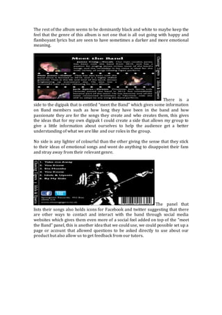 The document analyzes a digipak for a rock/pop album. It summarizes the design elements used, including the eye-catching album cover featuring a close-up eye, the predominantly black and white color scheme conveying a darker emotional tone, and a "Meet the Band" section introducing the band members. These elements provide ideas for the design of the student group's own digipak, such as including biographies of group members and using social media links to engage audiences.