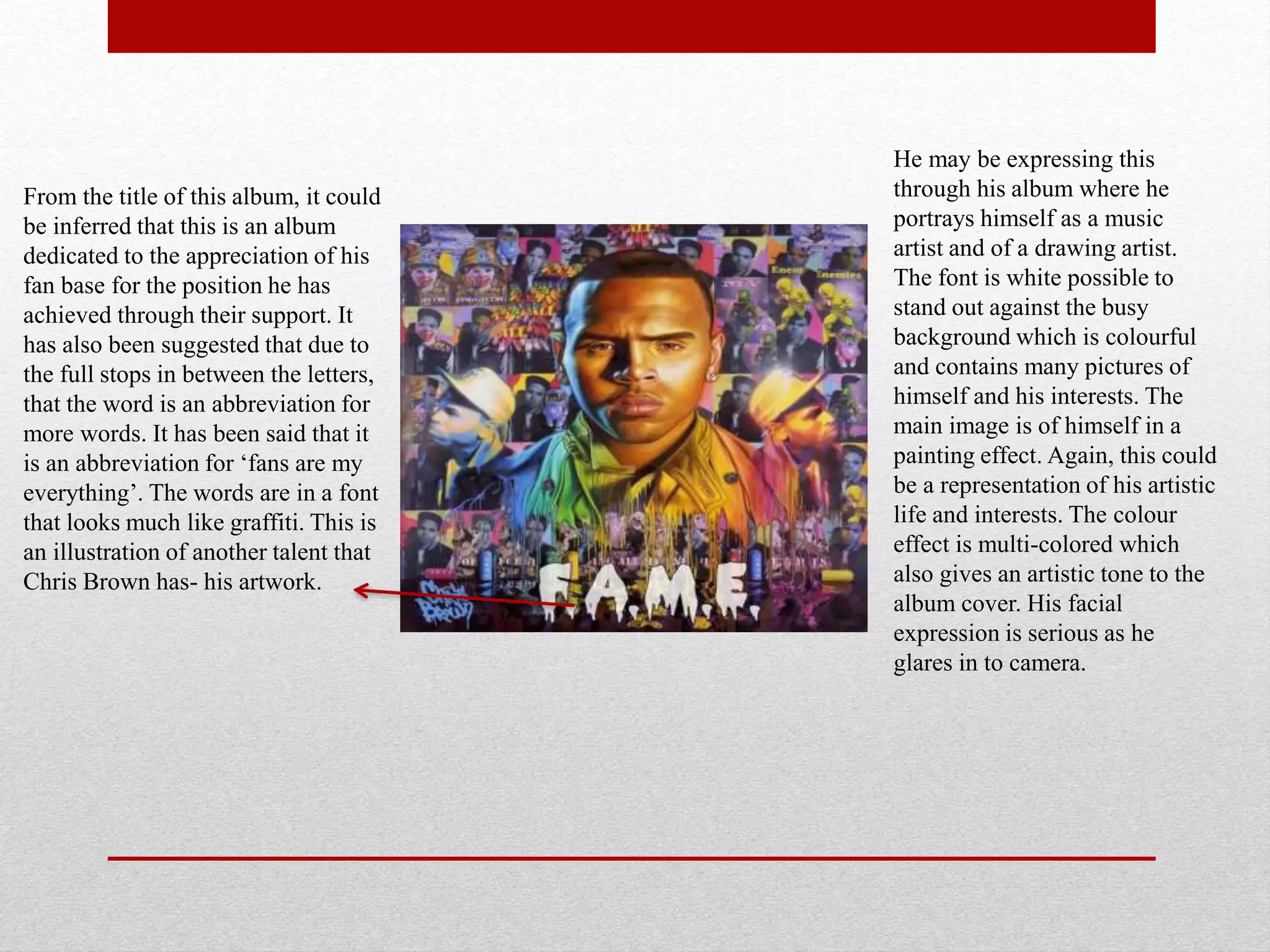The album cover depicts Chris Brown in a graffiti-style font, suggesting his appreciation for his fans and artistic talents in music and drawing. The colorful background includes images of Brown and words spelling "Forgiving all my enemies," portraying his move to a positive life. It shows domination of his new character over his old self. The serious expression and passionate music aim to connect Brown to his fans and guide their emotions.